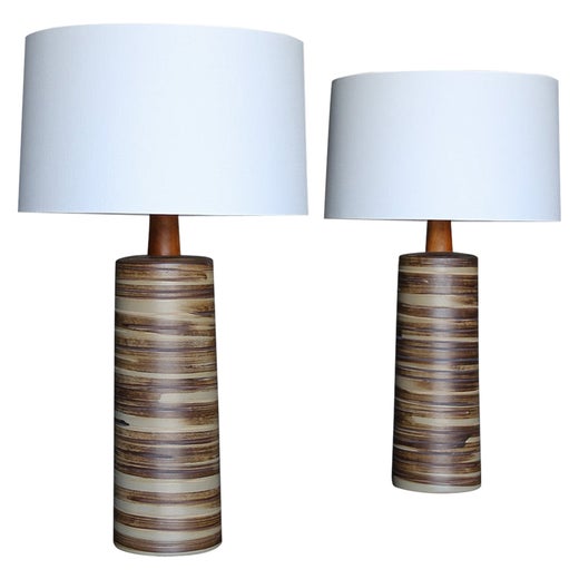 Gordon Martz and Jane Martz were prominent designers and creators of simple, elegant, handcrafted ceramic goods. Their vintage mid-century modern designs for table lamps, floor lamps, chandeliers and pendants are daring but relaxed and make for versatile additions to any space.