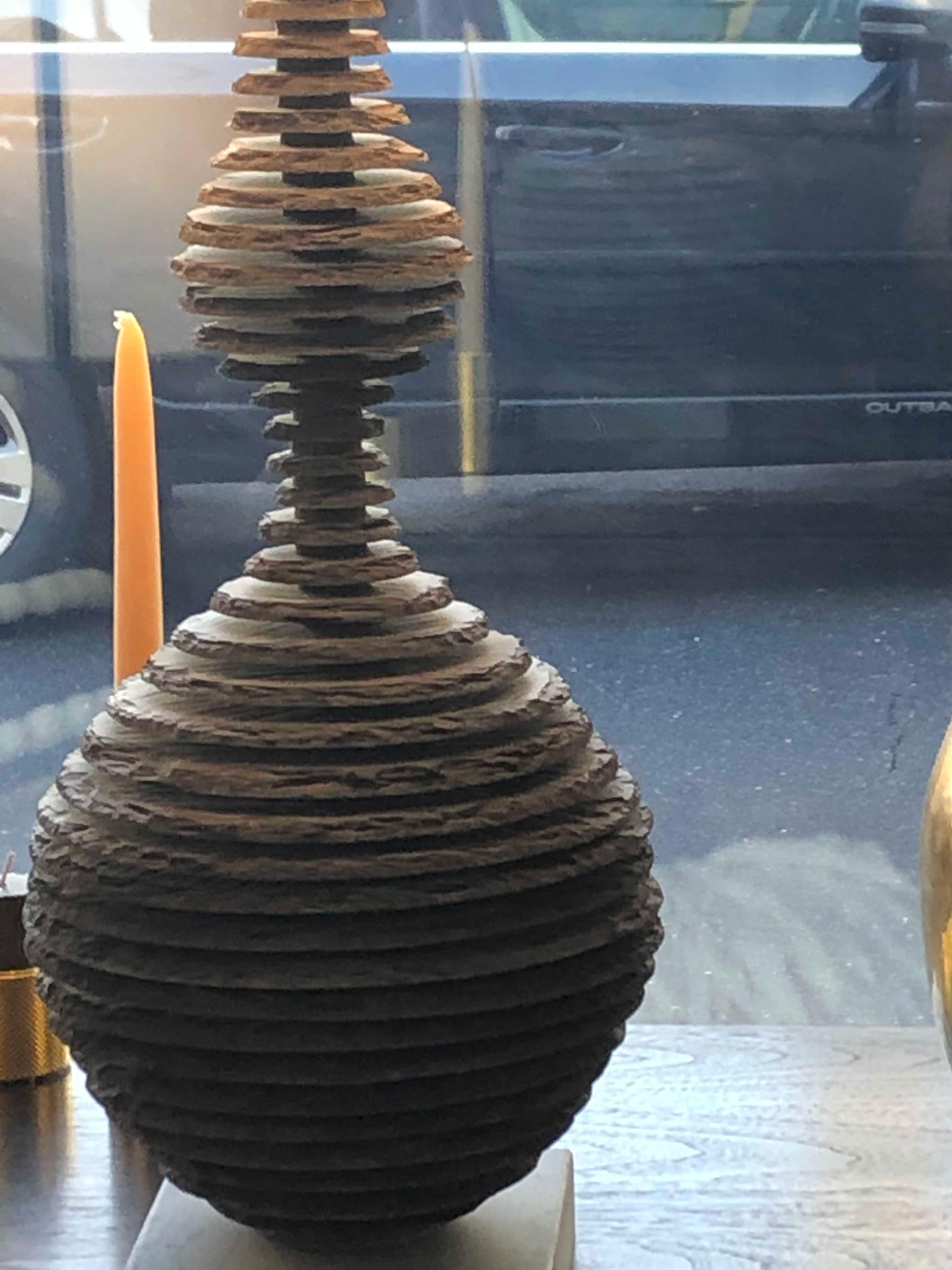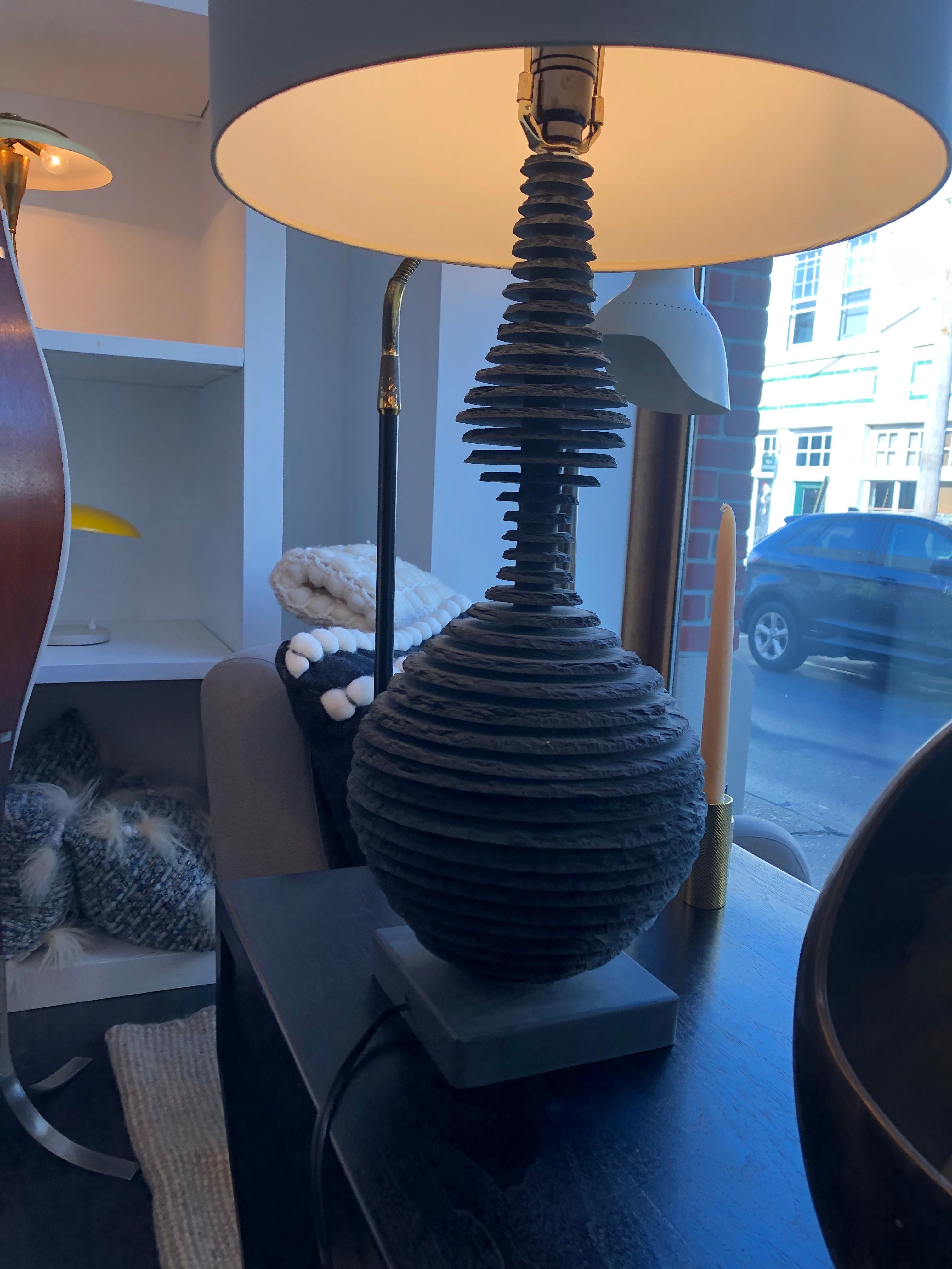 The lamp base is handcrafted with multiple individually carved sections of blue stone slate, then with mathematical precision is hand layered in horizontal...