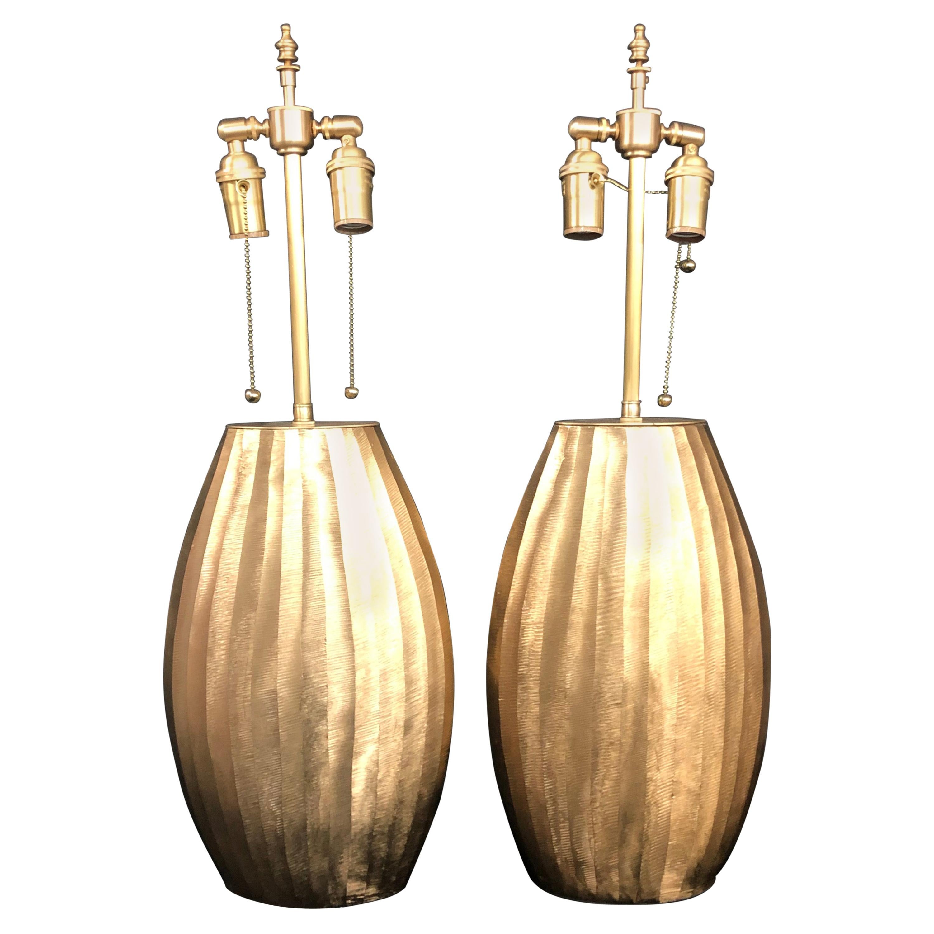 Unusual Custom Pair of Textured Brass Vessels with Lamp Application