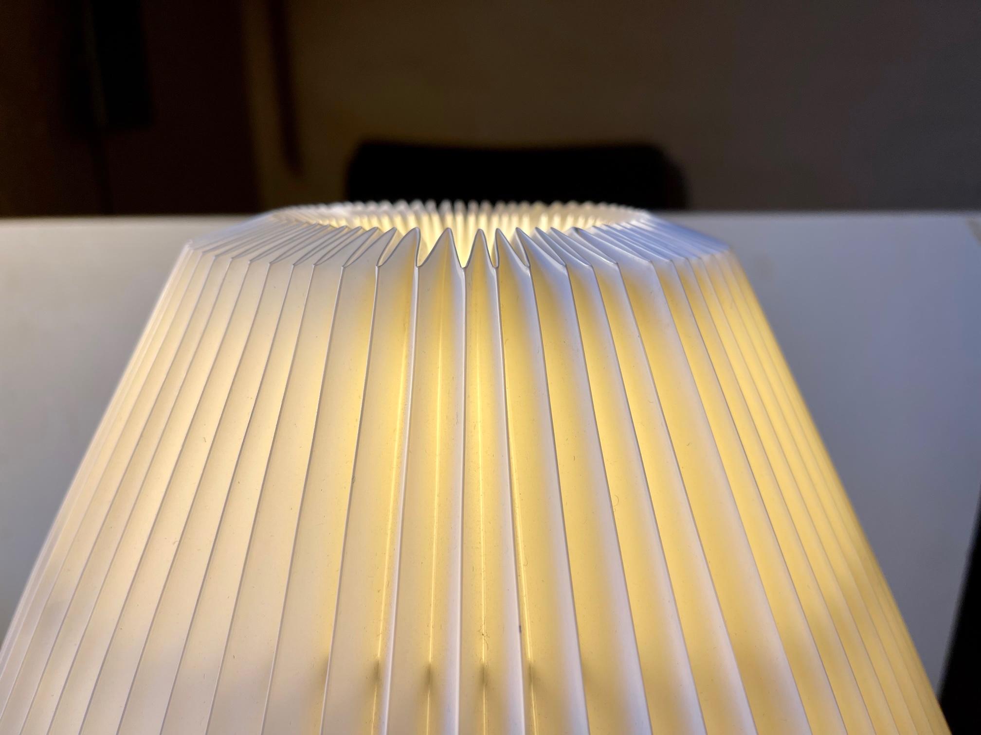 Large and exceptionally rare table light in frosted matté opaline glass. Manufactured by Voss/Holmegaard for Le Klint in Denmark during the 1950s or early 1960s. The fluted vintage Le Klint Shade by Tage Klint is made from folded paper and is included. The base retains its original sticker from Voss Belysning. Measurements: H: 57 cm, D: 30 cm.