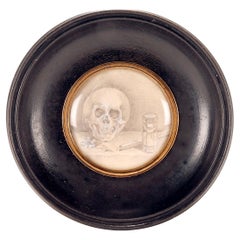 Miniature depicting a Vanitas Memento Mori painted in pencil on paper. The frame, made of ebonized fruitwood and finished with black wax, is round with a circleinside, bordered by a ...