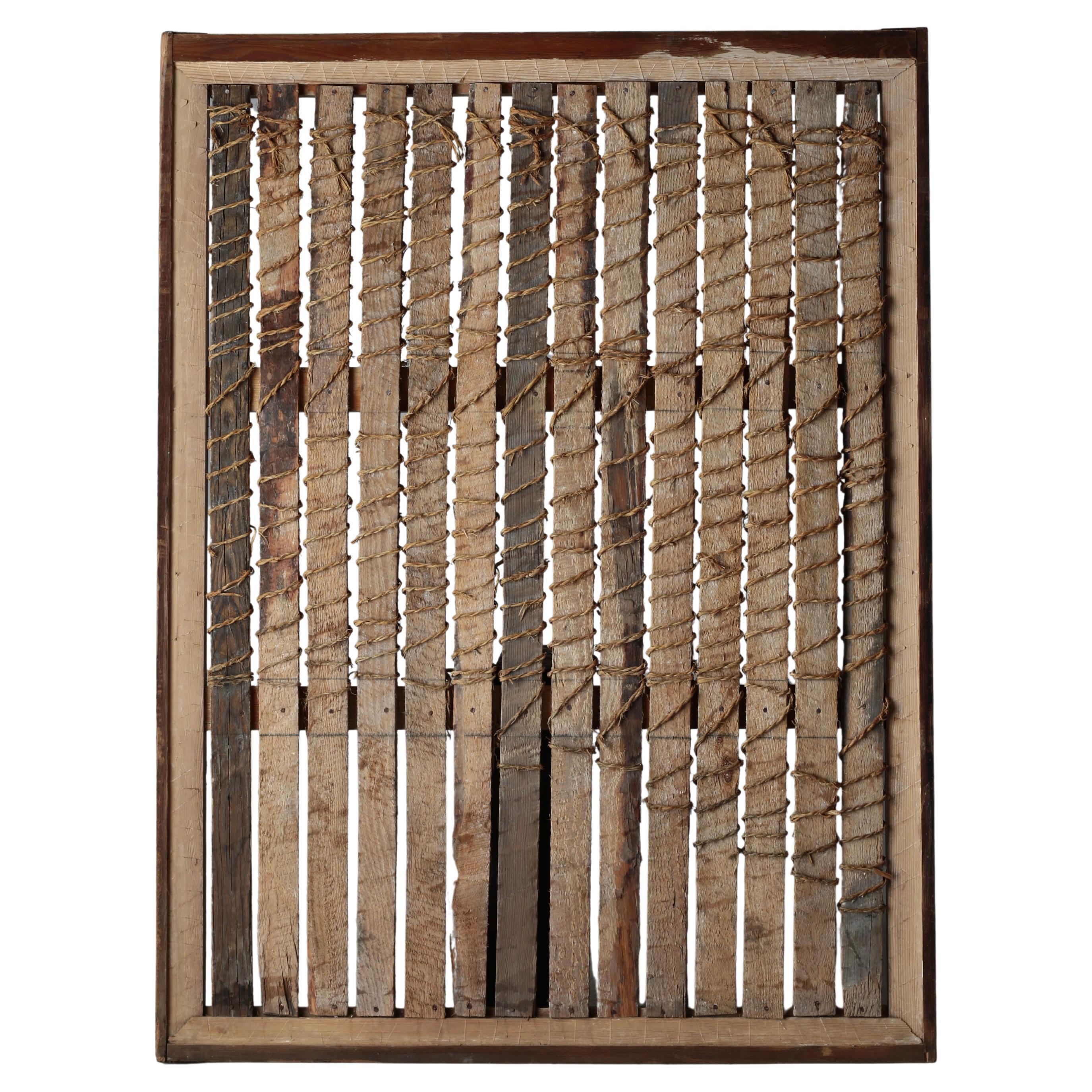 The rectangular seat, crafted from hand-woven twine, provides a sturdy base, resting low on four short feet. The front legs are baluster-shaped, adding a touch of elegance, while the back legs showcase a curving silhouette, enhancing the chair's overall aesthetic. The nicely weathered appearance of the wood gives this piece an authentic, timeworn charm that brings warmth and character to any space.
