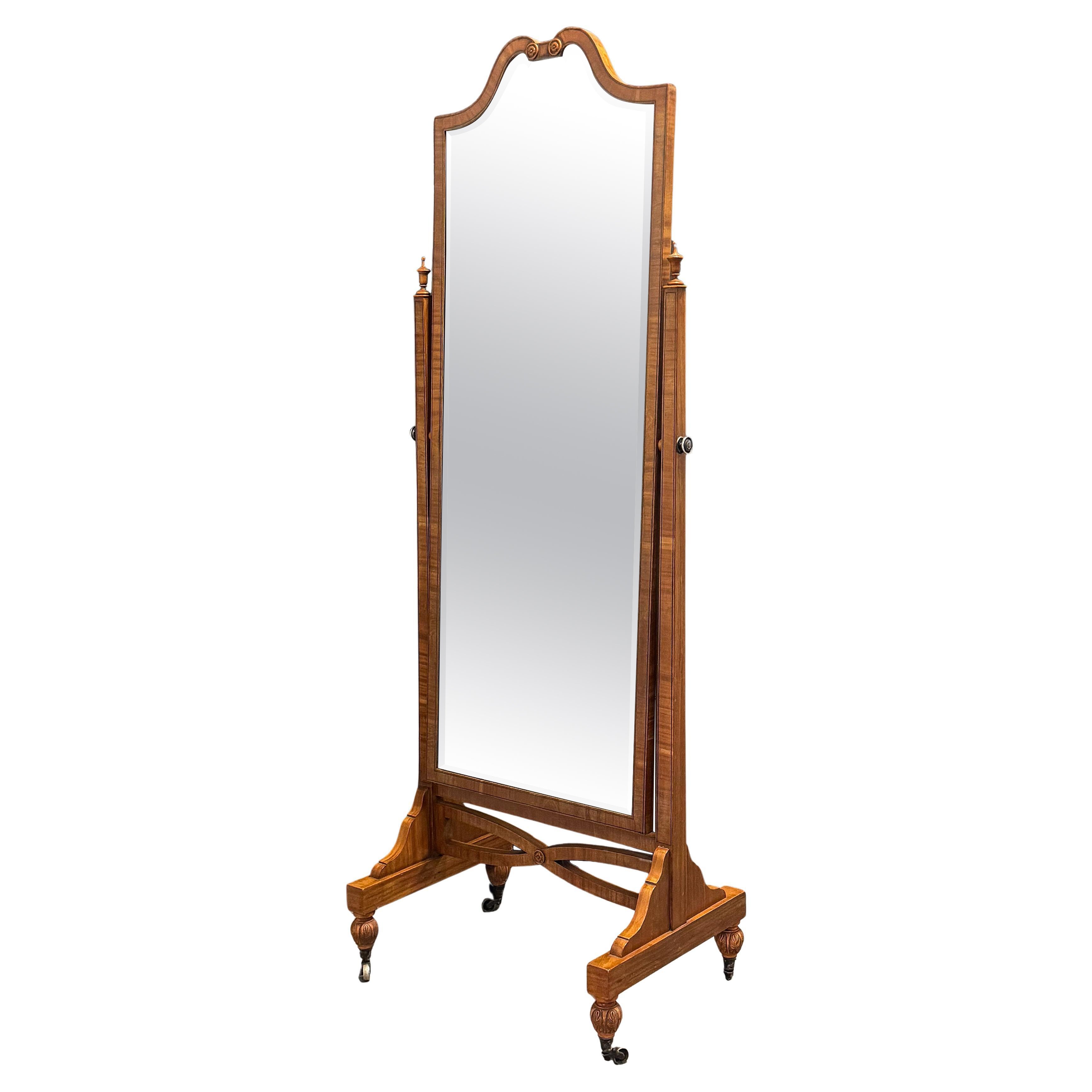 A fine large English cheval or full-length dressing mirror from the Edwardian era, featuring a mirrored glass panel framed in satinwood with inlaid stringing around the circumference...