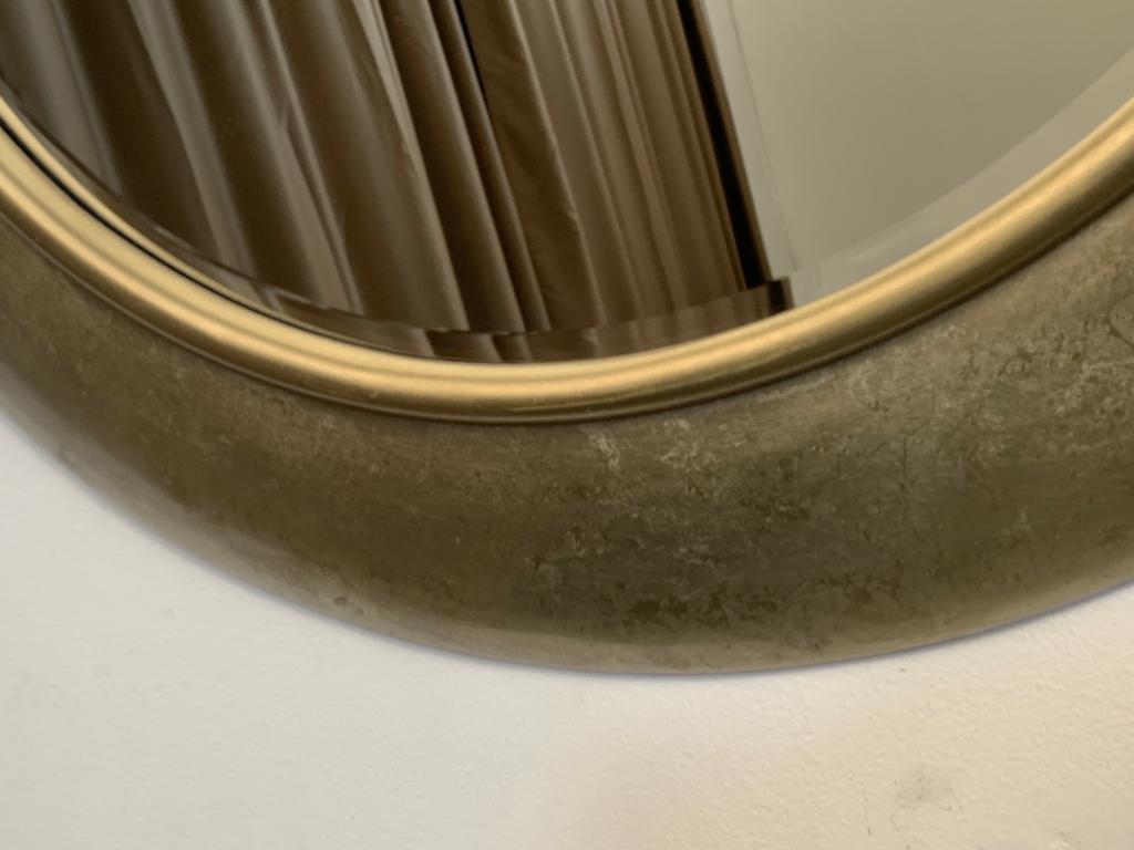 Circular beveled mirror with rounded frame of generous thickness covered in double metal leaf, the upper one crumpled and patinated. Polished finish.