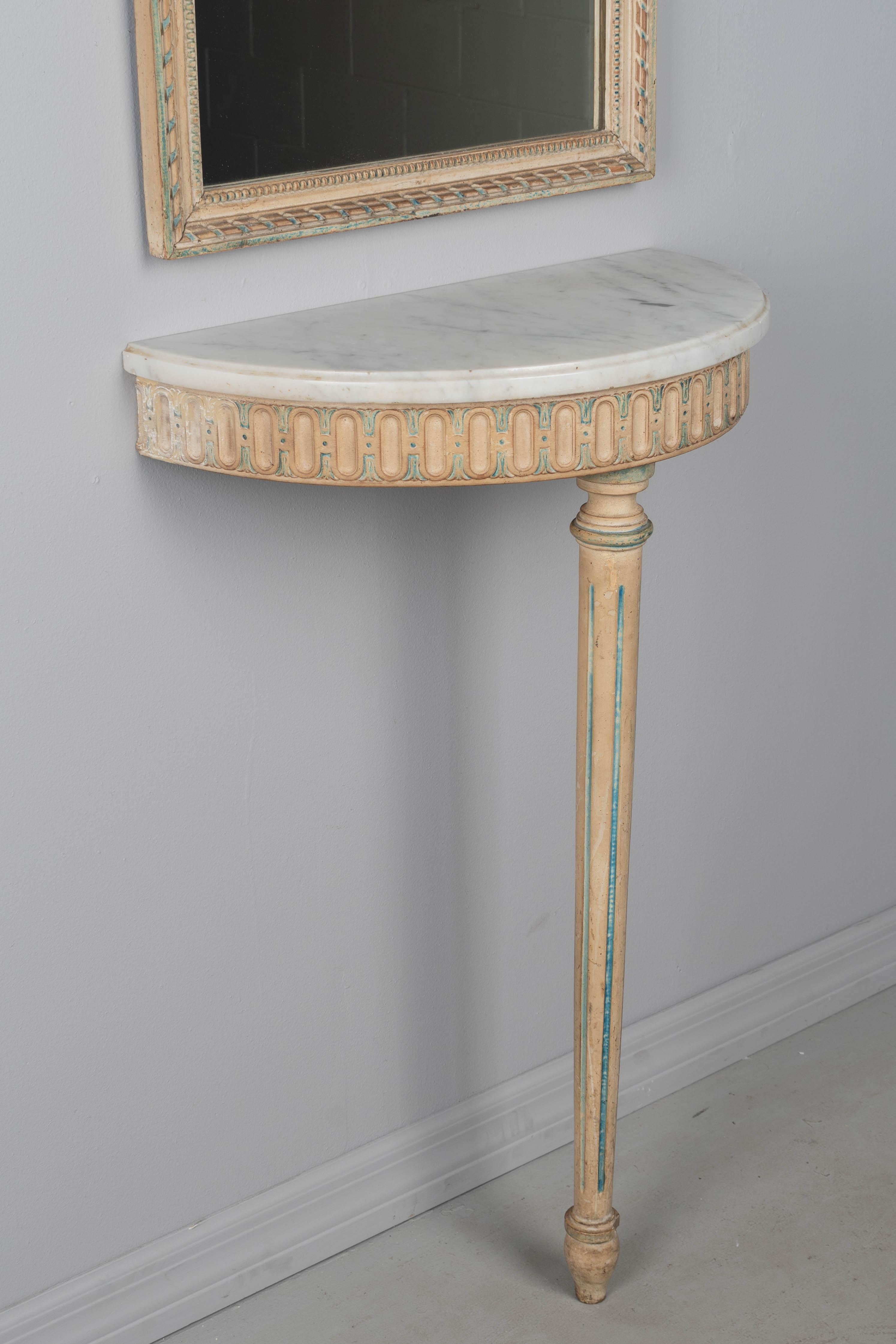 A Louis XVI style French polychrome painted mirror with matching demilune console table. Nice tall proportions with carved bow detail. Console has removable white marble top and will need to be fastened to the wall. Good condition with minor paint losses and touch up. Please refer to photos for more details. Circa 1950s. Shipping via white glove delivery only.