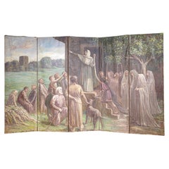 Vintage Chinese Black Lacquer 4 Panel Hand Painted Folding Screen Room Divider