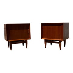 Condition: Expertly Refinished With over 15 years of experience, our workshop has followed a careful process of restoration, showcasing our passion and creativity for vintage designs that can seamlessly be incorporated with many interior decors. Enjoy! 😁 This pair of Mid-Century Modern nightstands embodies a clean, architectural simplicity that feels both timeless and functional. Crafted in walnut, each piece features two smoothly integrated drawers, offering practical storage while maintaining a minimal, uncluttered façade. Subtle details—like the exposed dovetail joinery and softly tapered legs—speak to the craftsmanship behind their construction without overwhelming the design. The proportions are thoughtfully balanced, giving them a light, elevated presence that works beautifully in both modern and classic interiors. Expertly refinished, the wood has been restored to a rich, even tone, highlighting the natural grain and ensuring a clean, cohesive presentation throughout. Fun Historical Fact Nightstands as we know them today became widely popular during the mid-20th century, as homes shifted toward more casual, functional living spaces. Designers began simplifying forms, moving away from ornate bedroom furniture...
