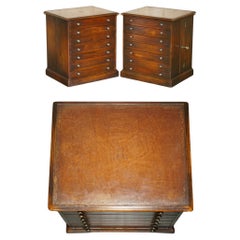 Finely crafted special edition end tables by the quality furniture maker. The deep cases with three graduated drawers inset into the case moldings and with brass pulls. The tops are ...