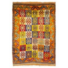 A rare and visually striking handwoven Moroccan wool rug showcasing bold Art Deco influence through its rhythmic geometric lines and rich, saturated hues. Crafted in the mid-20th cen...