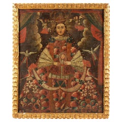 Peruvian Cuzco School Oil on Canvas of the Archangel Michael defeating Satan 18th Century.