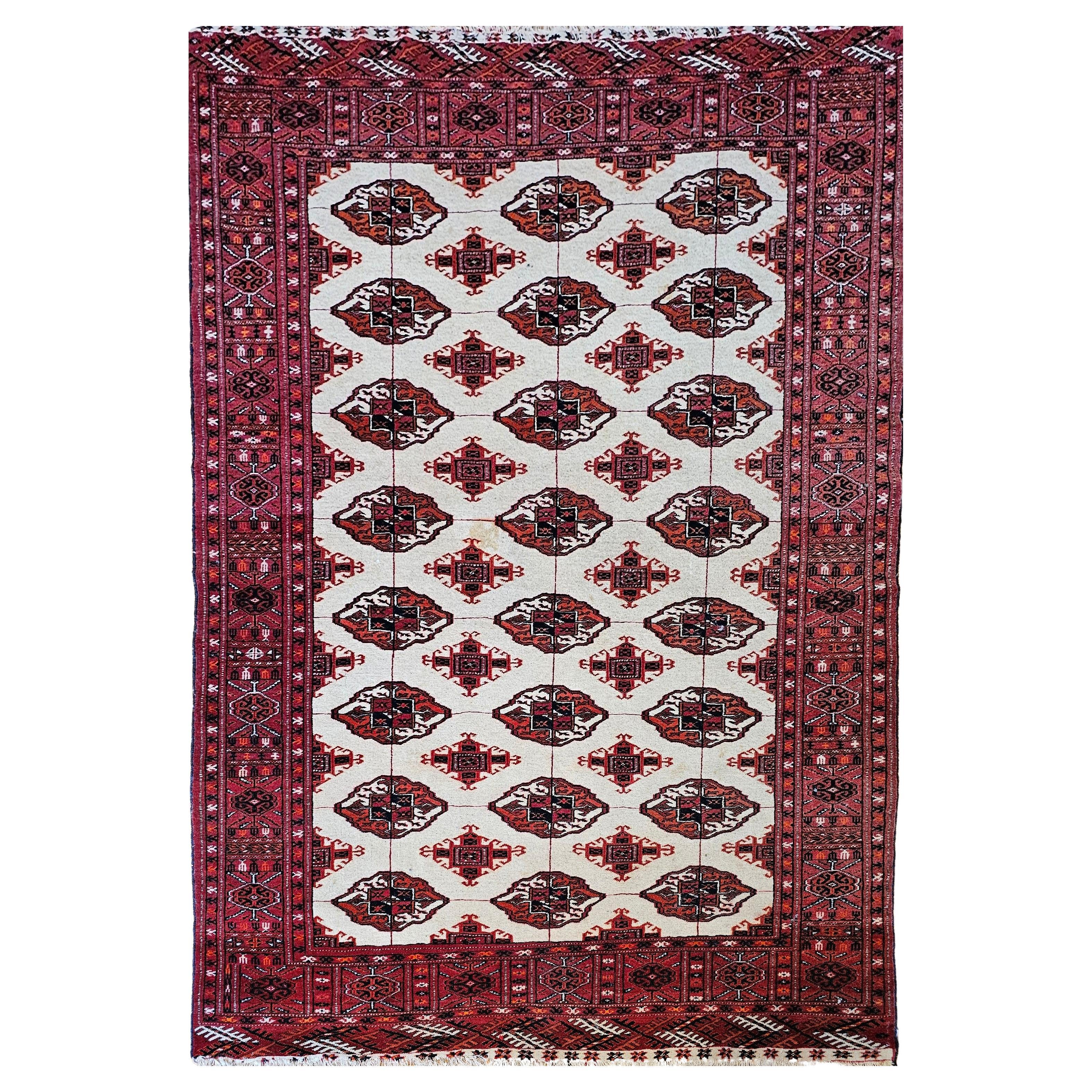 Vintage Turkmen Tekke in Allover Geometric Pattern in Red, Navy, Ivory, Blue