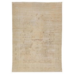 A highly unusual Indian Art Deco rug characterized by an all-over pattern consisting of large polychrome maple leafs carefully placed onto a salt and pepper brown and ivory backgroun...
