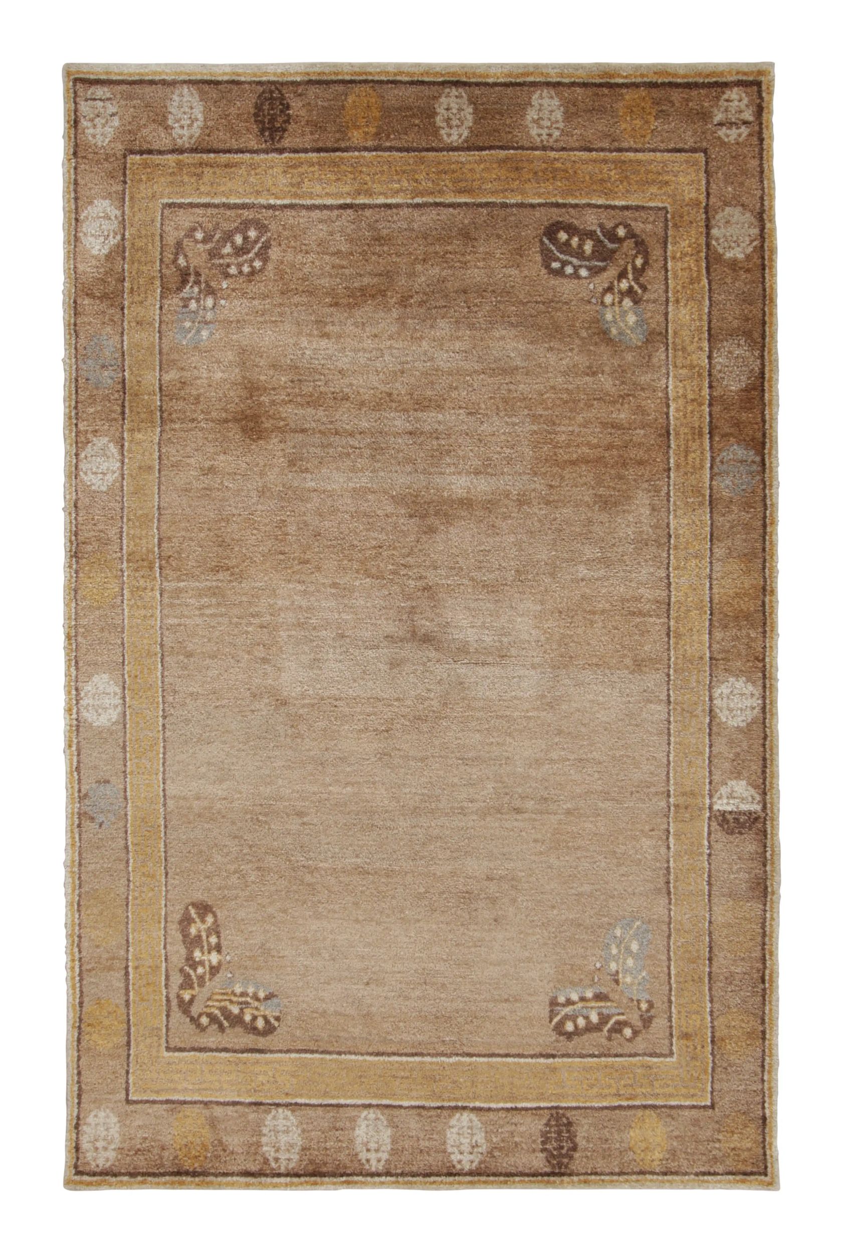 Colors: 13 custom-dyed colors. Main colors in the rug: sienna brown, cerulean blue, maroon brown, sage green, and a warm combination of wheat cream, tan beige and cantaloupe.