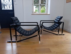 Hans Eichenberger DS 2030 low-backed leather Lounge Chair & matching Ottoman. Produced by DeSede, Switzerland. Black leather with with chromed steel base. A timeless Swiss design cla...