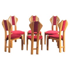 Mario Marenco for Mobil Girgi, set of six dining chairs, walnut, fabric, Italy, 1970s Set of sculptural chairs designed by Mario Marenco for Mobil Girgi, distinguished by their str...