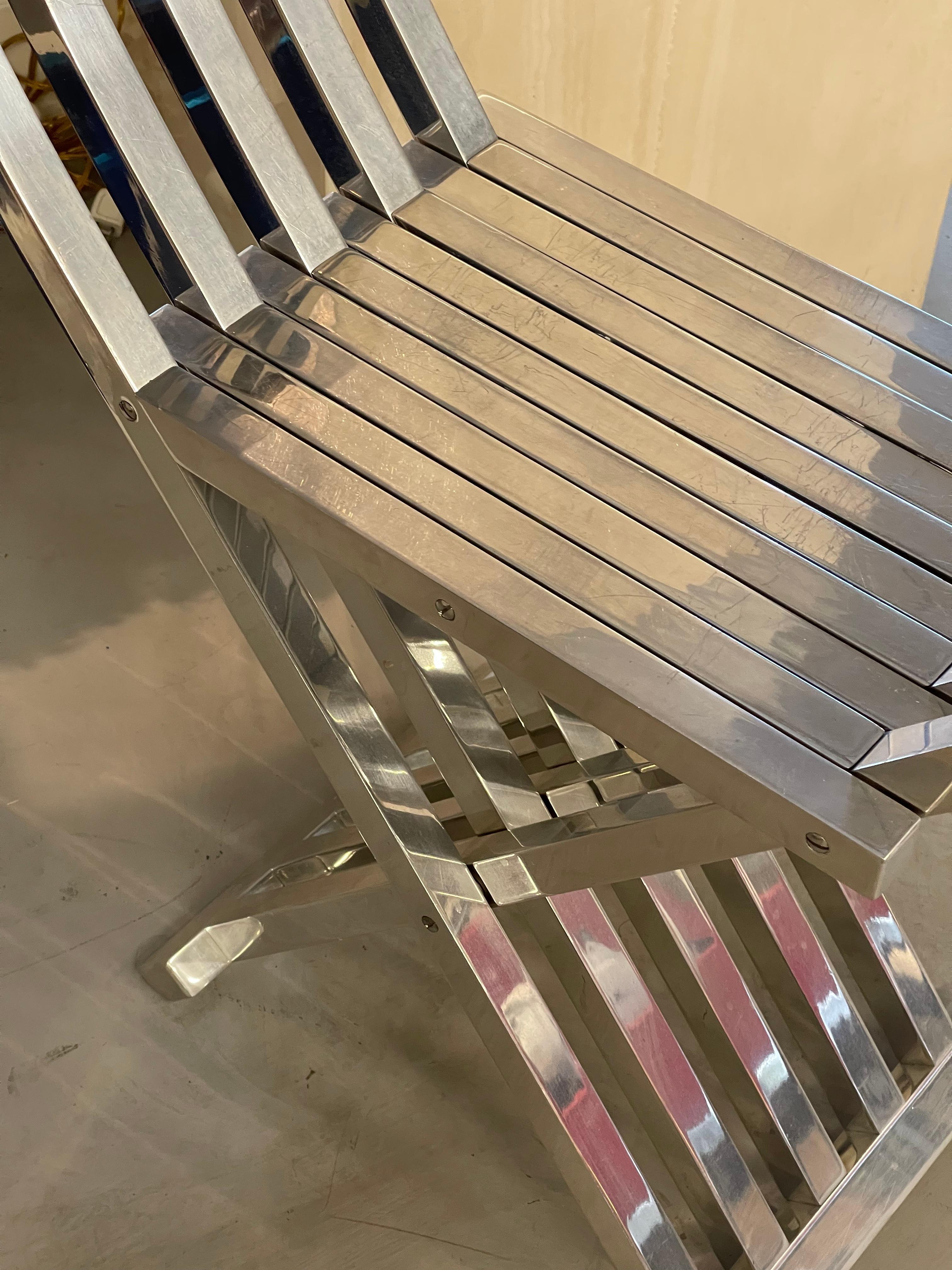 Nice vintage 1970’s John Vesey X Bench. Oak sides. Good vintage original condition. Quite a few scratches to the steel surfaces. This bench is from a wonderful Palm Springs estate filled with an incredible collection of modern masters of art including Warhol, Rauschenberg, Hockney, Stella and others. The estate heirs kept the art and sold us the great furnishings which we have listed on this site, please have a look. The bench is pictured in consecutive photos next to a Herman Miller Eiffel tower rocker and an Eames rosewood chair.