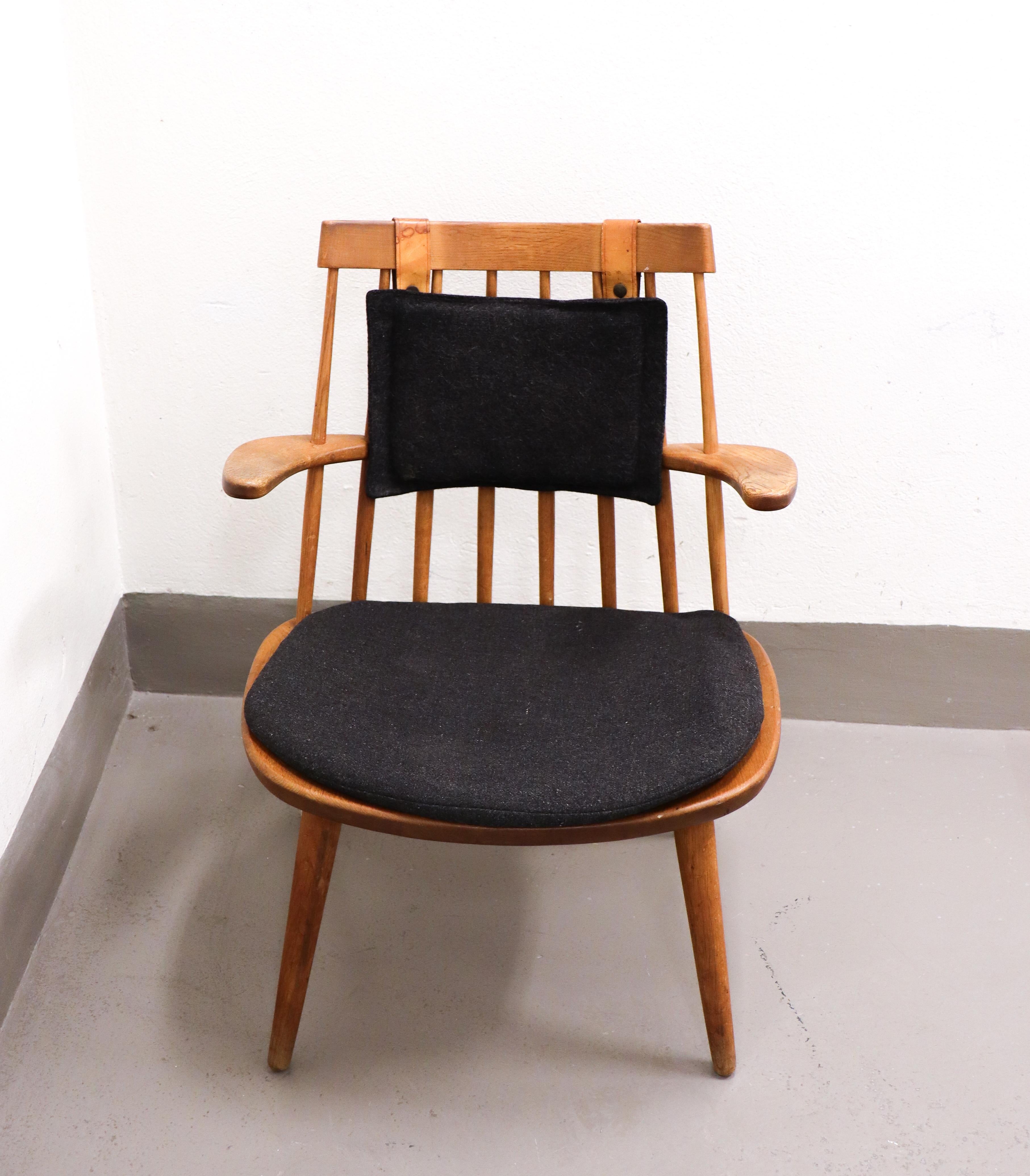 - Condition:Wear consistent with age and use. This piece is in very good overall condition, with only minor signs of age. The wood shows a light patina with a few small stains, consistent with gentle use over time. It comes complete with a neck pillow and seat cushion, both in very good conditio.
