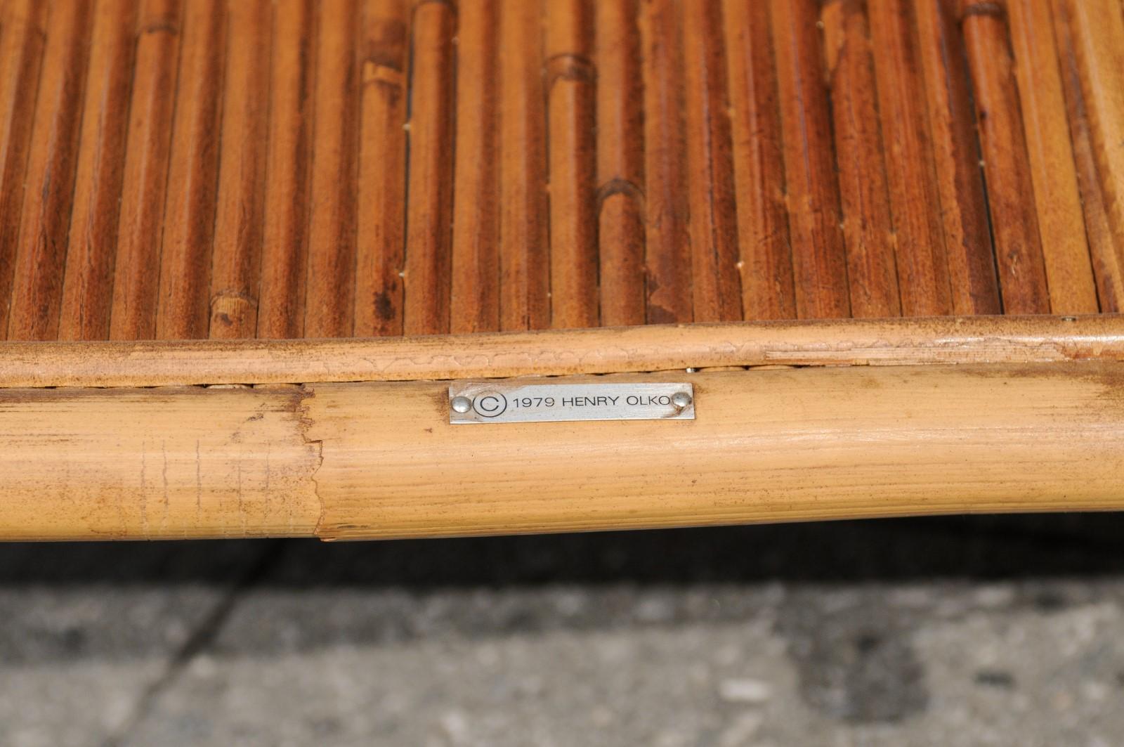 An incredibly rare and beautiful sofa by the Great Henry Olko for his Willow and Reed firm, circa 1980. This stunning example is from Olko's boutique "Manau" series. Expertly crafted rattan construction with a panels in bamboo; beautiful accents in cane. This particular seating series displays all of the design characteristics that makes this gifted Artist's work so memorable and special. An accomplished formally trained architect with a Master's degree from MIT, Mr. Olko was never satisfied with the ordinary; he routinely reached to achieve the spectacular. Olko furniture is far more than Rattan - it is Art. Important pieces designed to anchor an important space. Excellent restored condition. The rattan has aged to absolute perfection. The frames have been professionally cleaned and re-lacquered. The rattan projects a rich warmth and range of color. Lacquer finish with fabulous depth and sheen. All bamboo and accent bindings are intact and complete. The arm height is 25 inches. Retains the Maker mark.