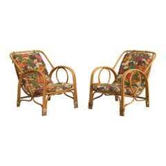 A striking pair of mid-century lounge chairs crafted in bamboo and rattan, produced in Finland in the 1940s. The chairs feature an expressive organic form with curved armrests, slopi...