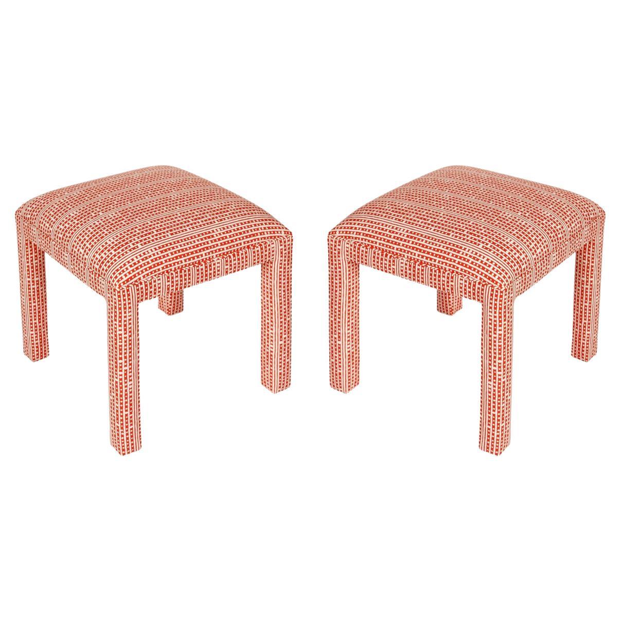 Vintage pair of 1970s parsons stools, benches, ottomans. Newly upholstered in a. fabulous coral fabric. Dimensions: 18.5 H x 29 W x 18.5 D.