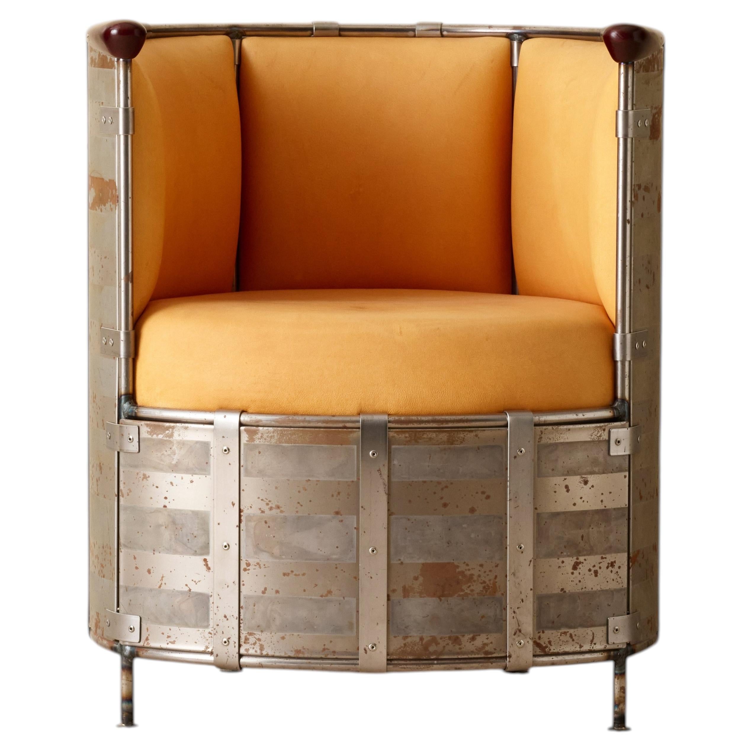 The FPE chair is one of Ron Arad’s most iconic plastic-and-metal designs. It uses an ingenious method: a single sheet of injection-molded polypropylene is slid flat into double-barrelled aluminum extrusions, then bent into shape under pressure — creating a light, flexible but structurally sound chair without screws, glue, or welding.