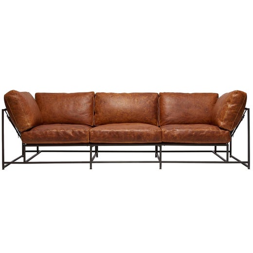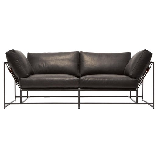 This version of our Inheritance Two Seat Sofa is upholstered in black canvas. The foam seat cushions have been wrapped in polyfiber for added softness and comfort. Sitting atop a blackened steel frame, the two seat sofa is strapped with support belts featuring black cotton webbing, black leather, and blackened antique buckles.