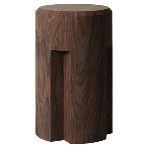 Crafted from walnut, the cylindrical form, sharp cutouts, and gentle sloping bevel of the M_002 Counter Stool blend to create a sophisticated brutalist masterpiece.