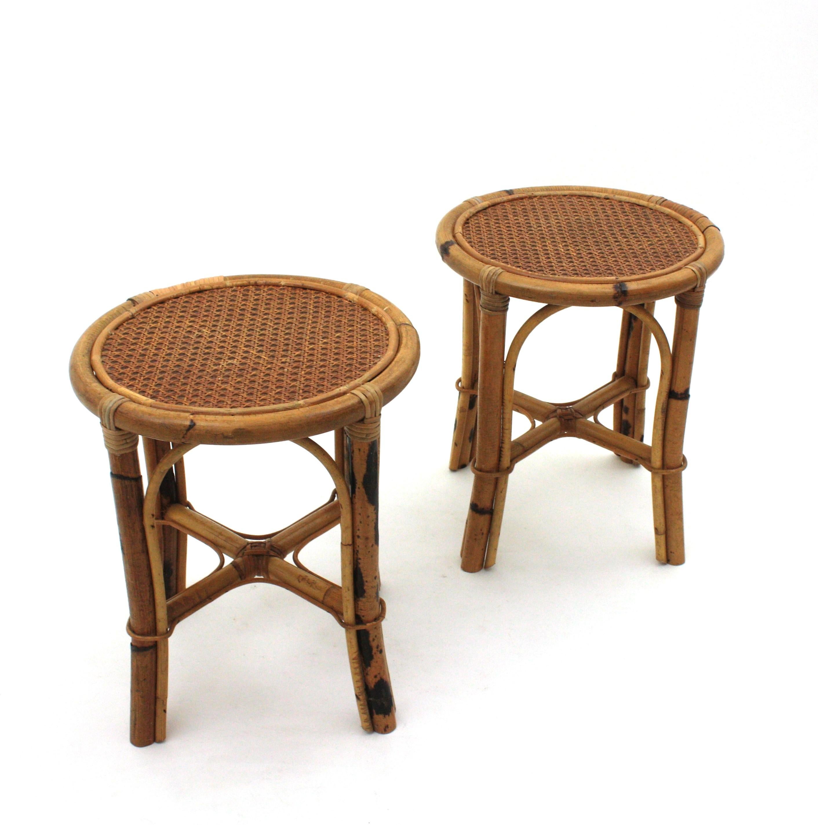 View AllPair of Bamboo Rattan Round Stools or Side Tables, Franco Albini Style