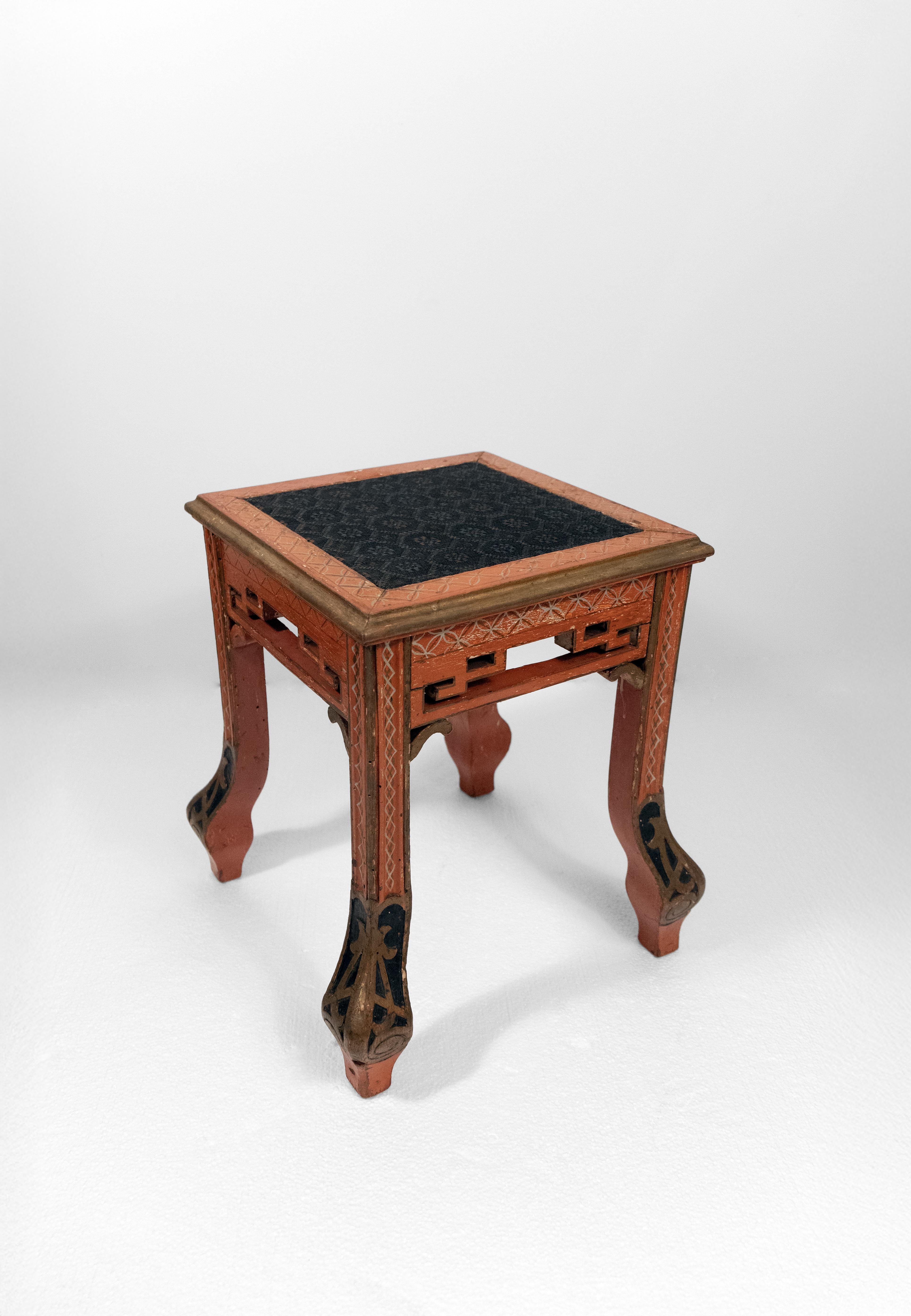 A lovely antique lacquered chinoiserie stool in the oriental style. This was made in England, it dates from around the 1900-1920 period.
