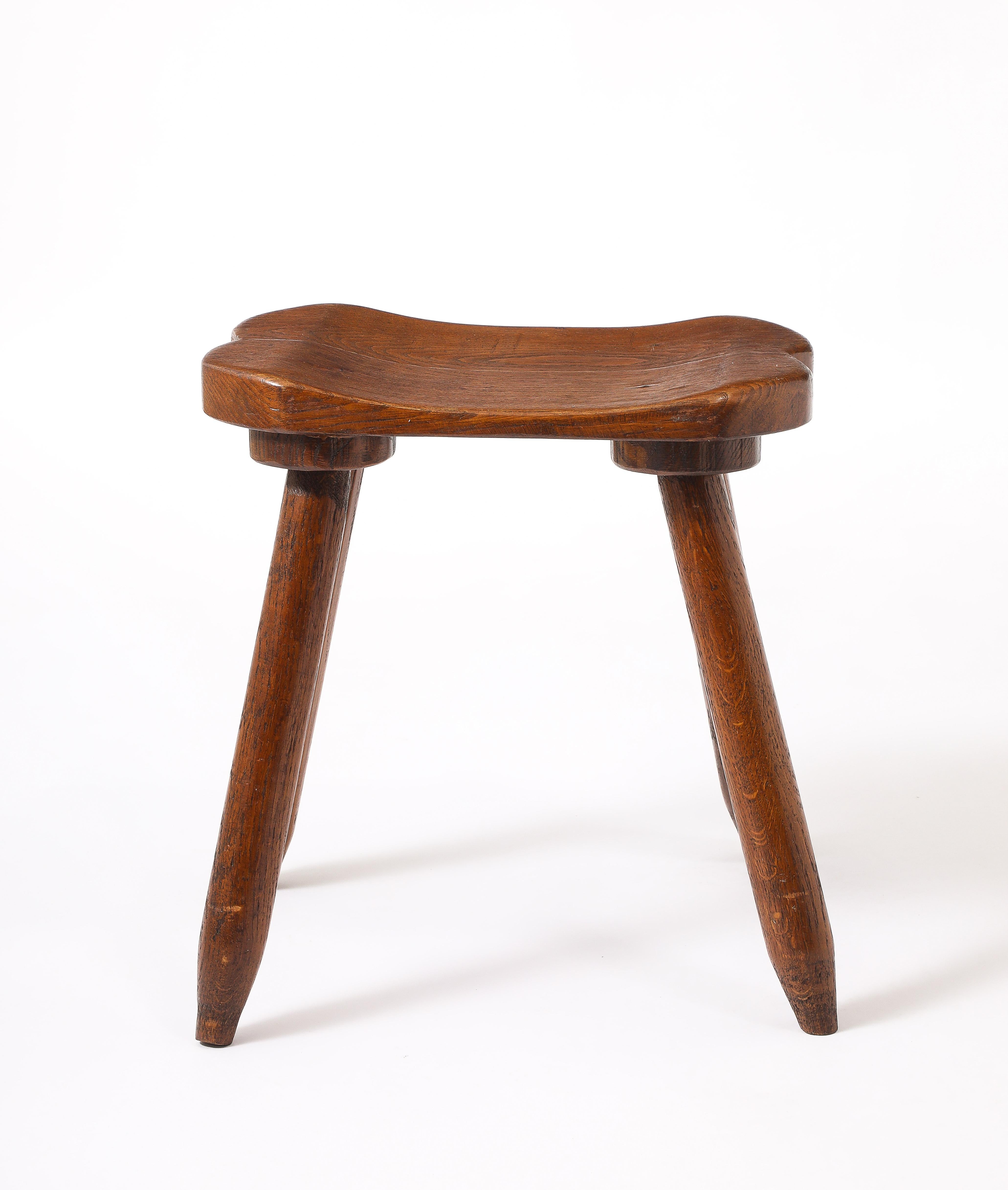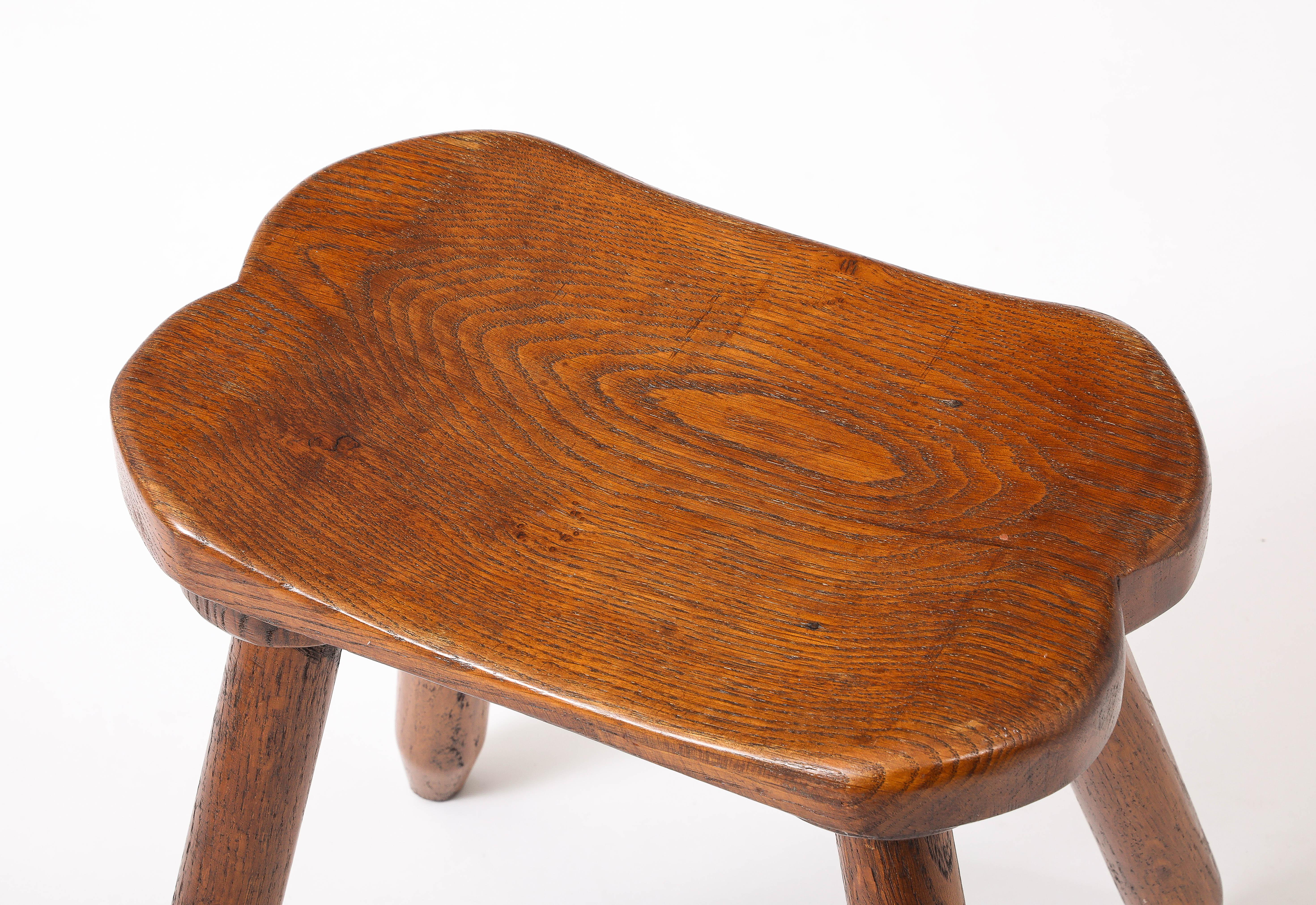 Splayed Leg Tripodal Faceted Dark Elm Stools, France 1960's