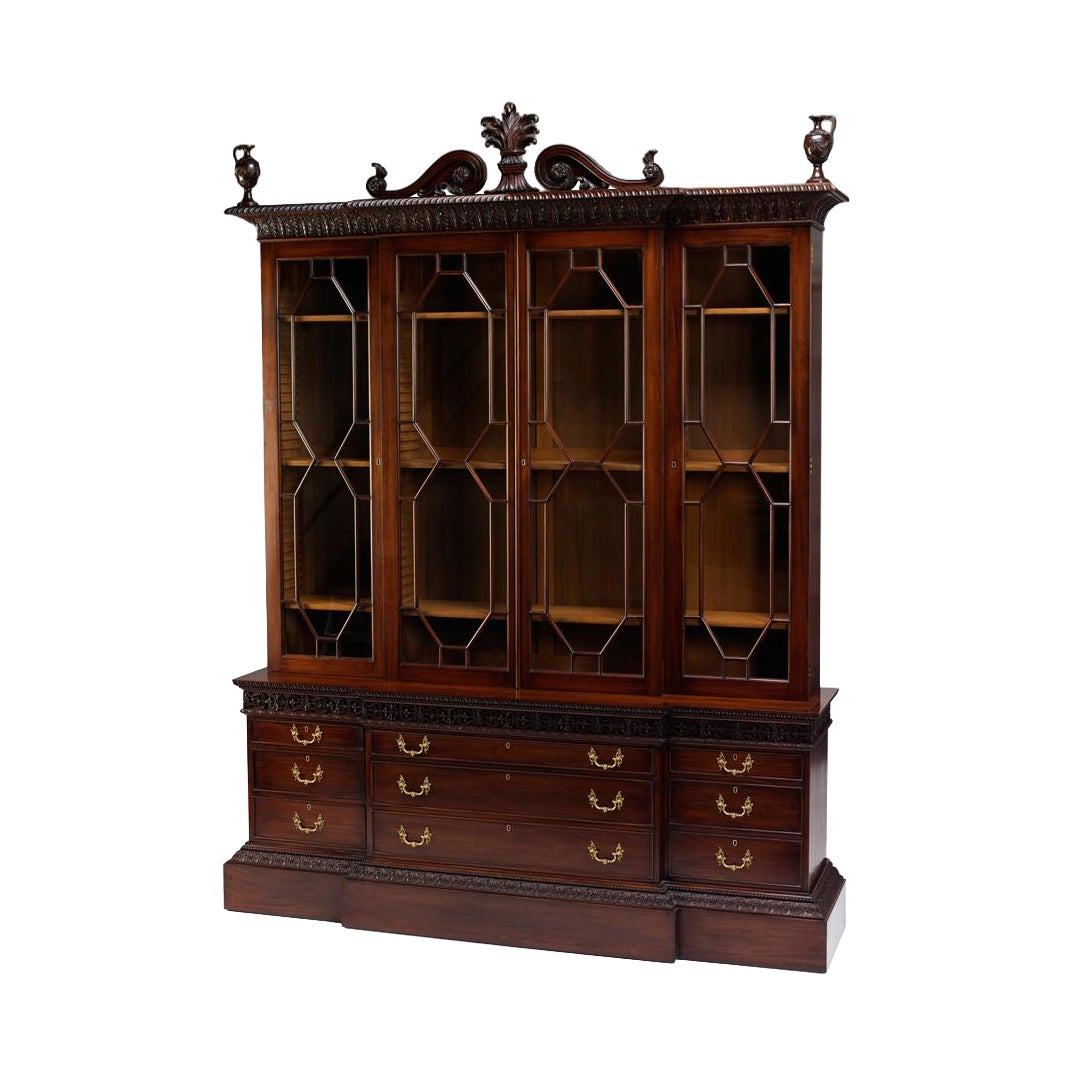 Antique Georgian Carved Mahogany Breakfront Bookcase Cabinet, Circa 1900