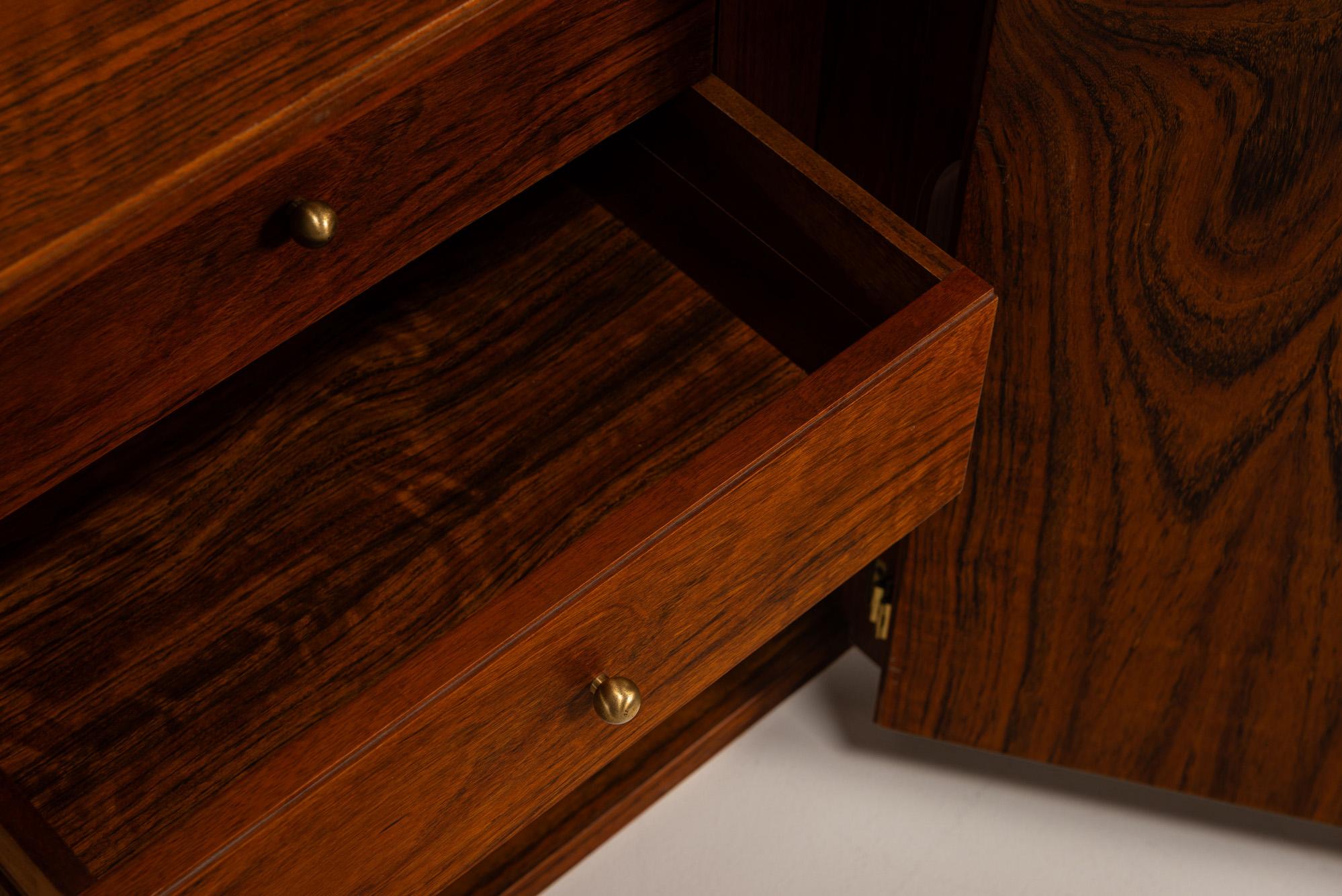 The surface is veneered on all sides, including the interior, demonstrating the same attention to detail throughout. Subtle magnetised closures allow the doors to open effortlessly and close silently. Inside, the central cabinet reveals four drawers, each fitted with small, patinated brass knobs, while the flanking compartments are sectioned with internal shelves for practical storage. The use of solid brass and the continuous walnut grain across the drawers and doors confirms the careful construction and design intent.