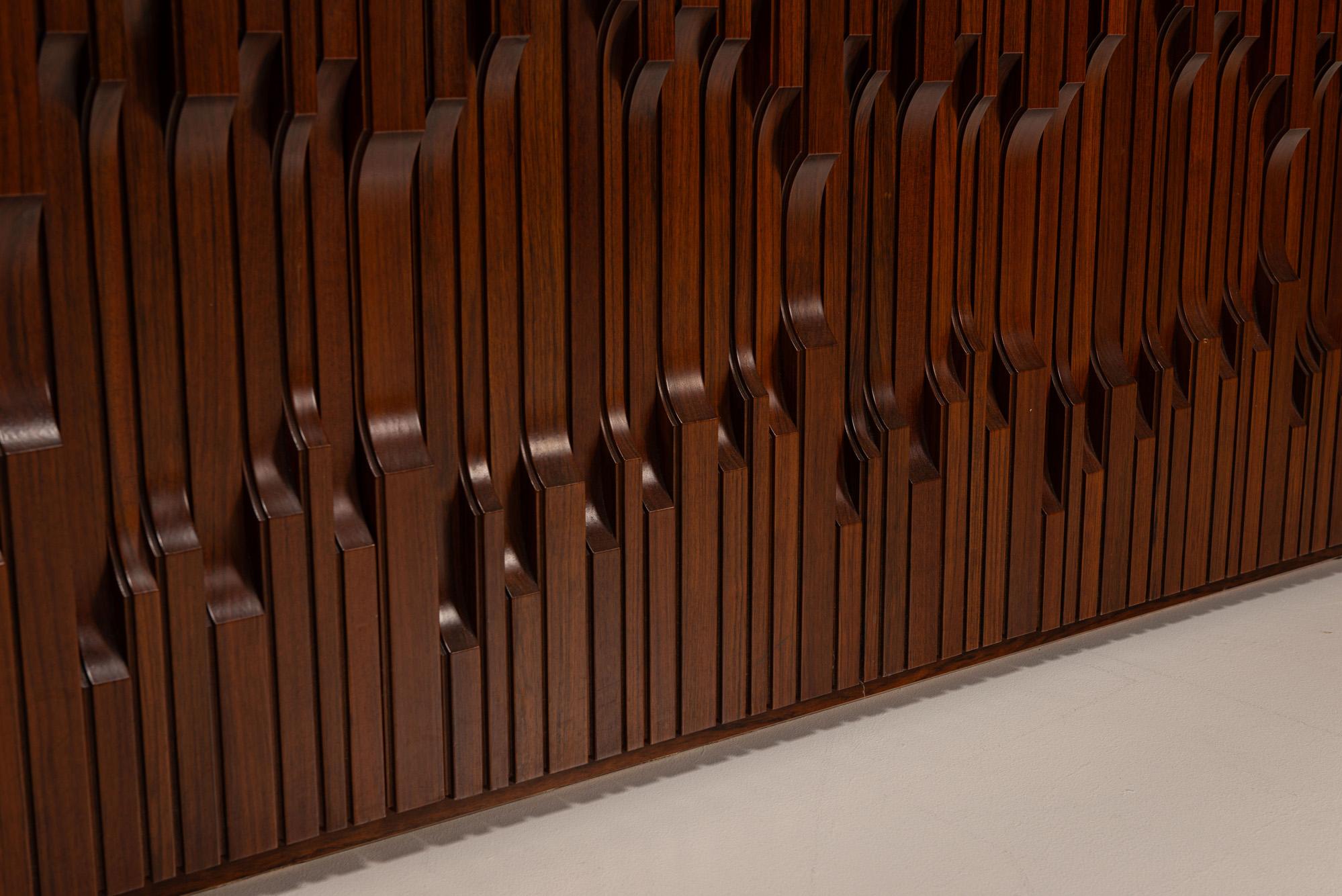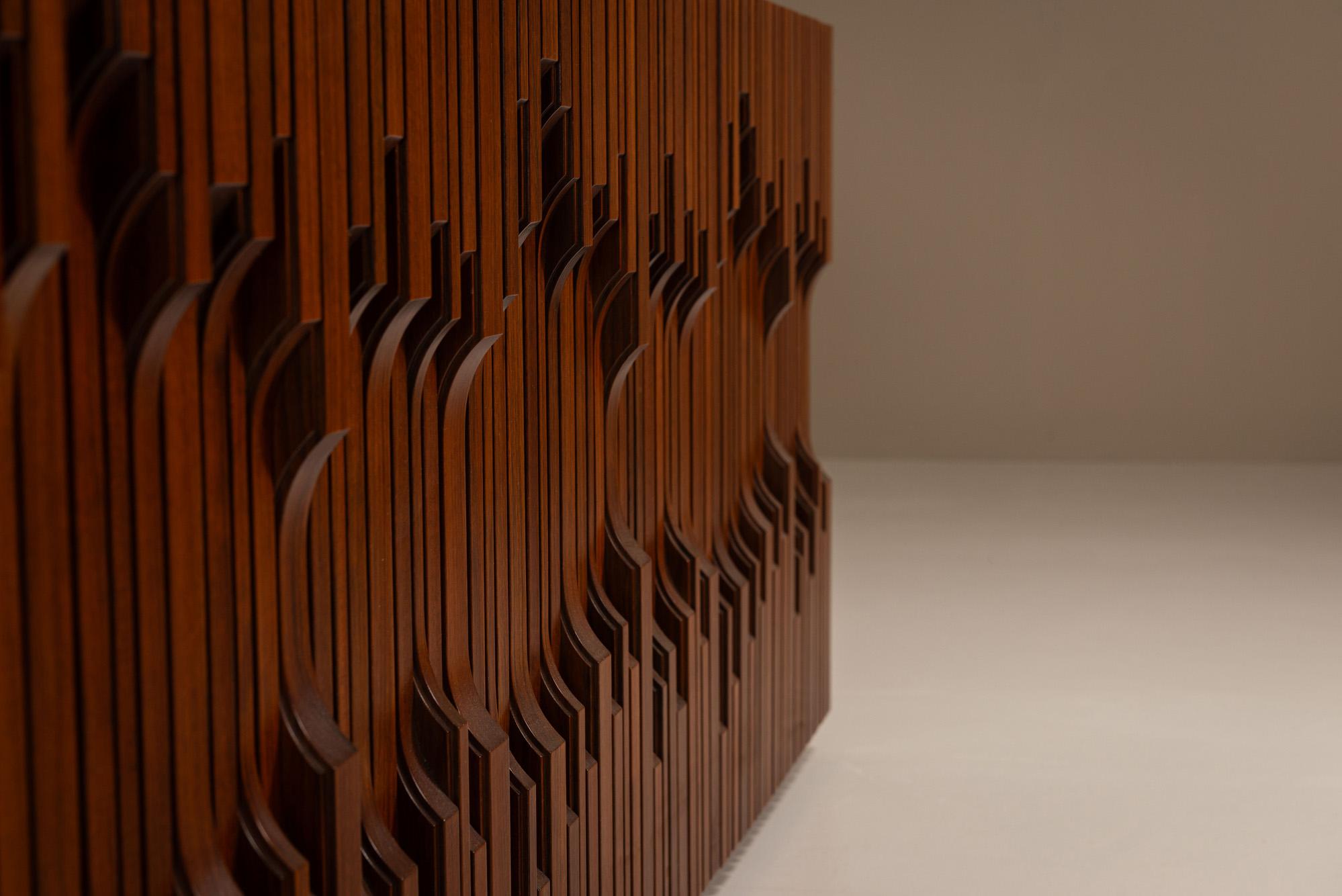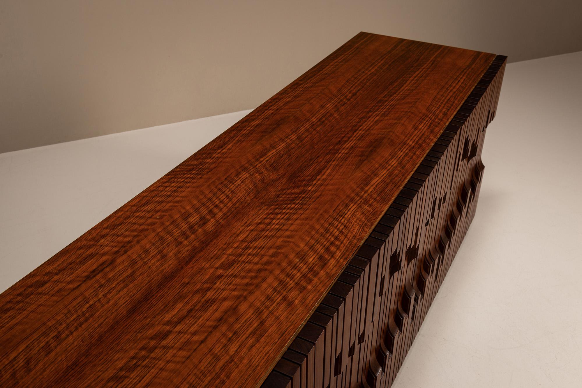 Made from richly figured African walnut, the piece presents a rhythmic facade of deeply carved vertical slats. The geometric relief work is not merely decorative, it gestures toward a musical staff, an abstract composition reminiscent of piano keys, echoing Frigerio’s own background as a trained pianist. Each element is cut and assembled to form a flowing, tactile surface that invites touch and visual study.