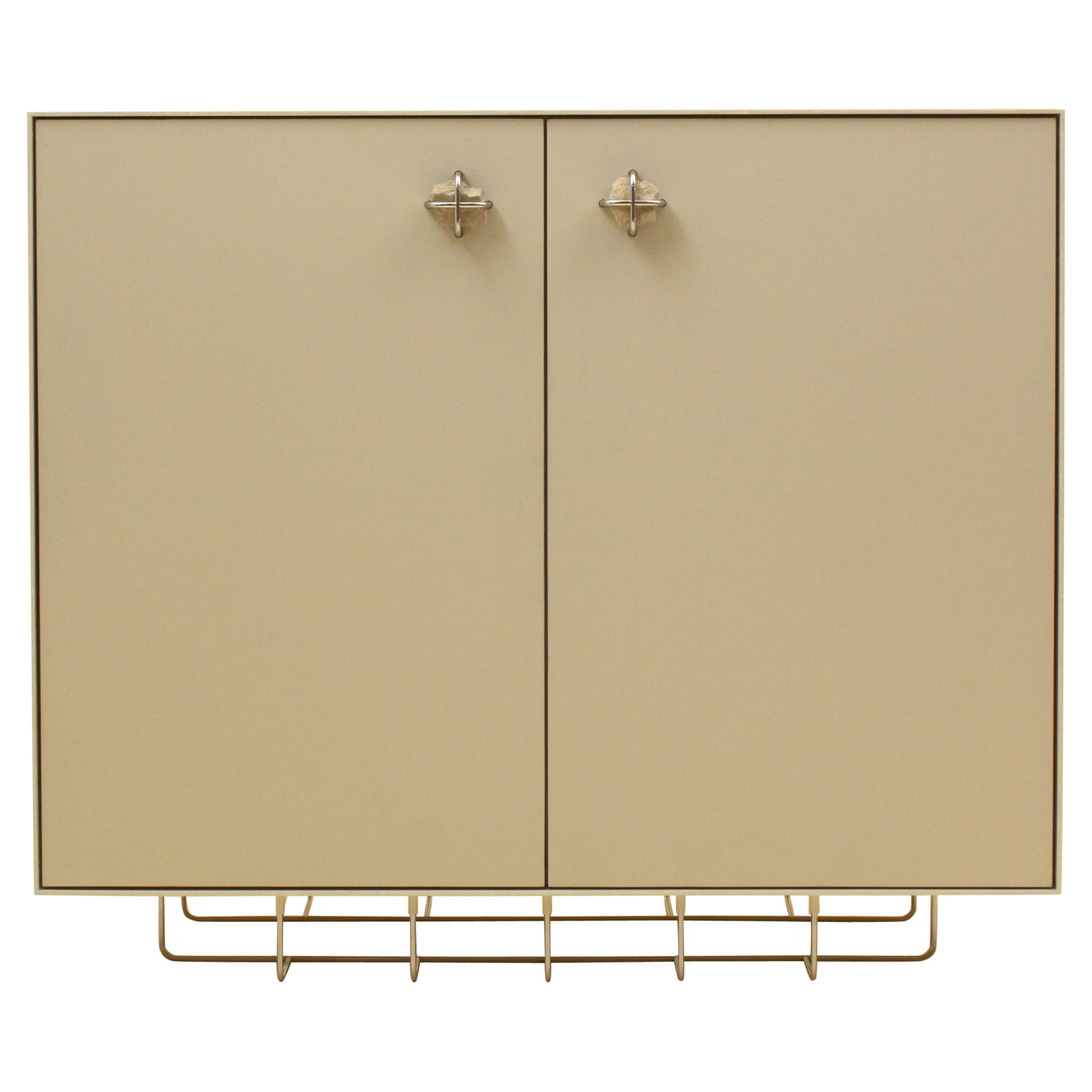 Featuring a cerused oak exterior, with tambour doors on the lower credenza, sculpted handles (which slide to reveal a keyhole, no key is present however can be rekeyed) on the upper hutch...