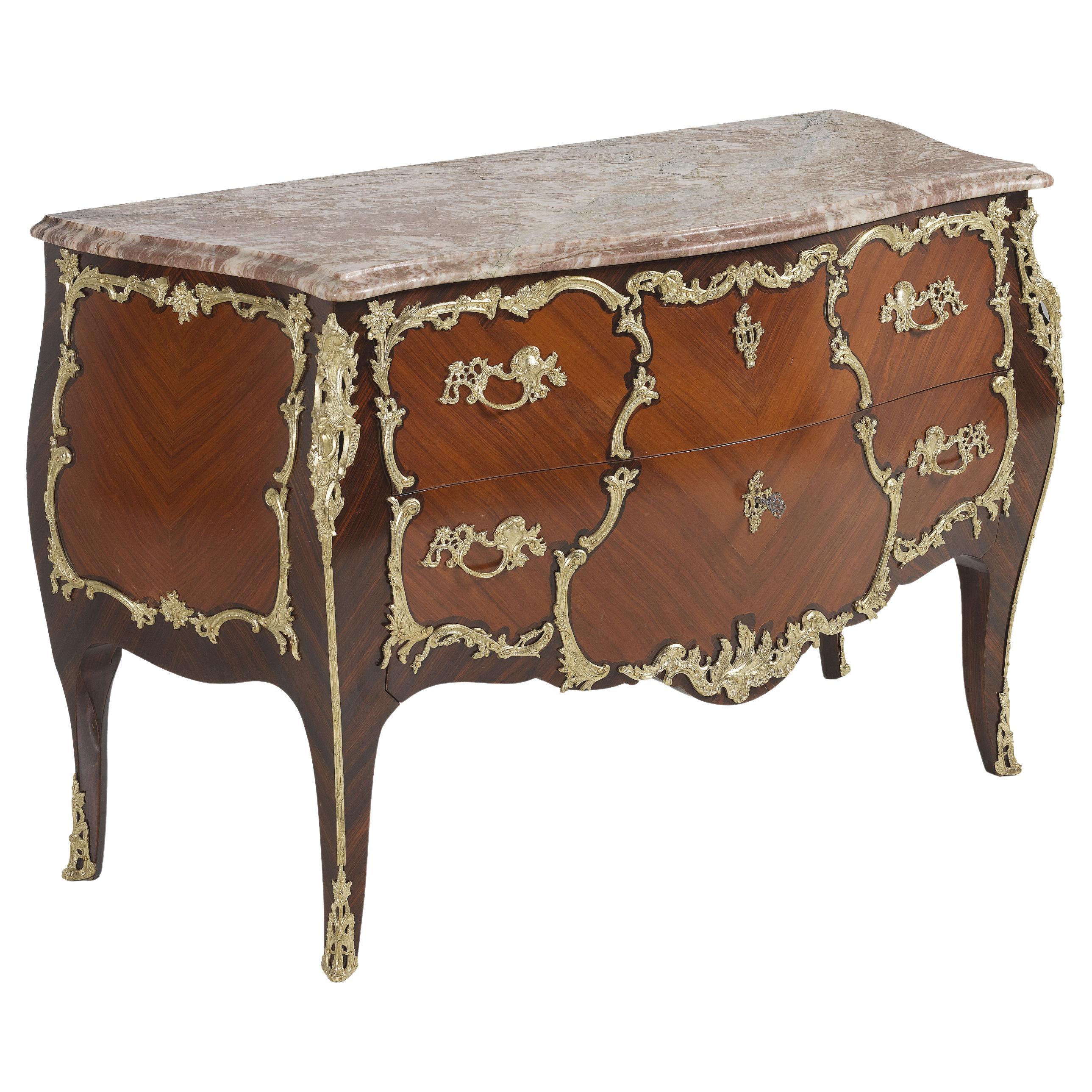This elegant commode typifies the fashion for furniture mounted with exotic and rare woods, exquisite marquetry-work, and decadent Rococo bronzes.