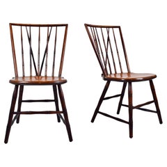 A pair of 20th century American Windsor chairs with continuous hoop backs, saddles seats, turned legs tapering to narrow feet, and their original black painted finishes. Perfect at a...