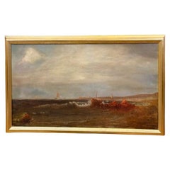 This is an antique Danish oil on canvas maritime painting of a group of fishermen launching a wooden boat into a restless sea. Some stand i knee-deep water, others are already aboard...