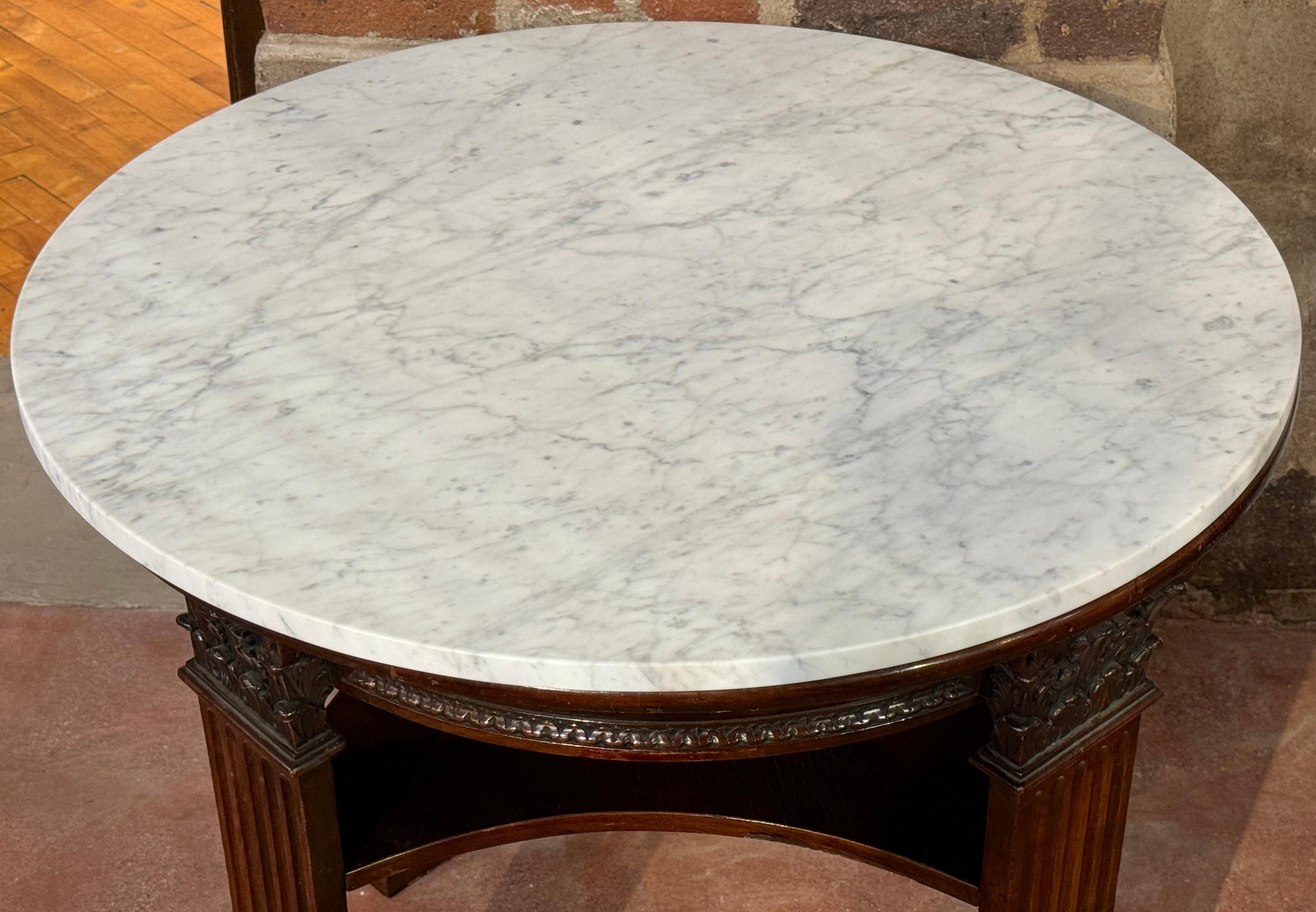 A superb 19th-century English Neoclassical Corinthian Column Marble Top Library Table, England, circa 1880. This architectural table stands 31.75 inches high with a 33.5-inch diameter, displaying the refined aesthetic of English Regency Neoclassicism. The table features a Carrera marble top, known for its durability and white hue, which contrasts beautifully with the rich mahogany base.