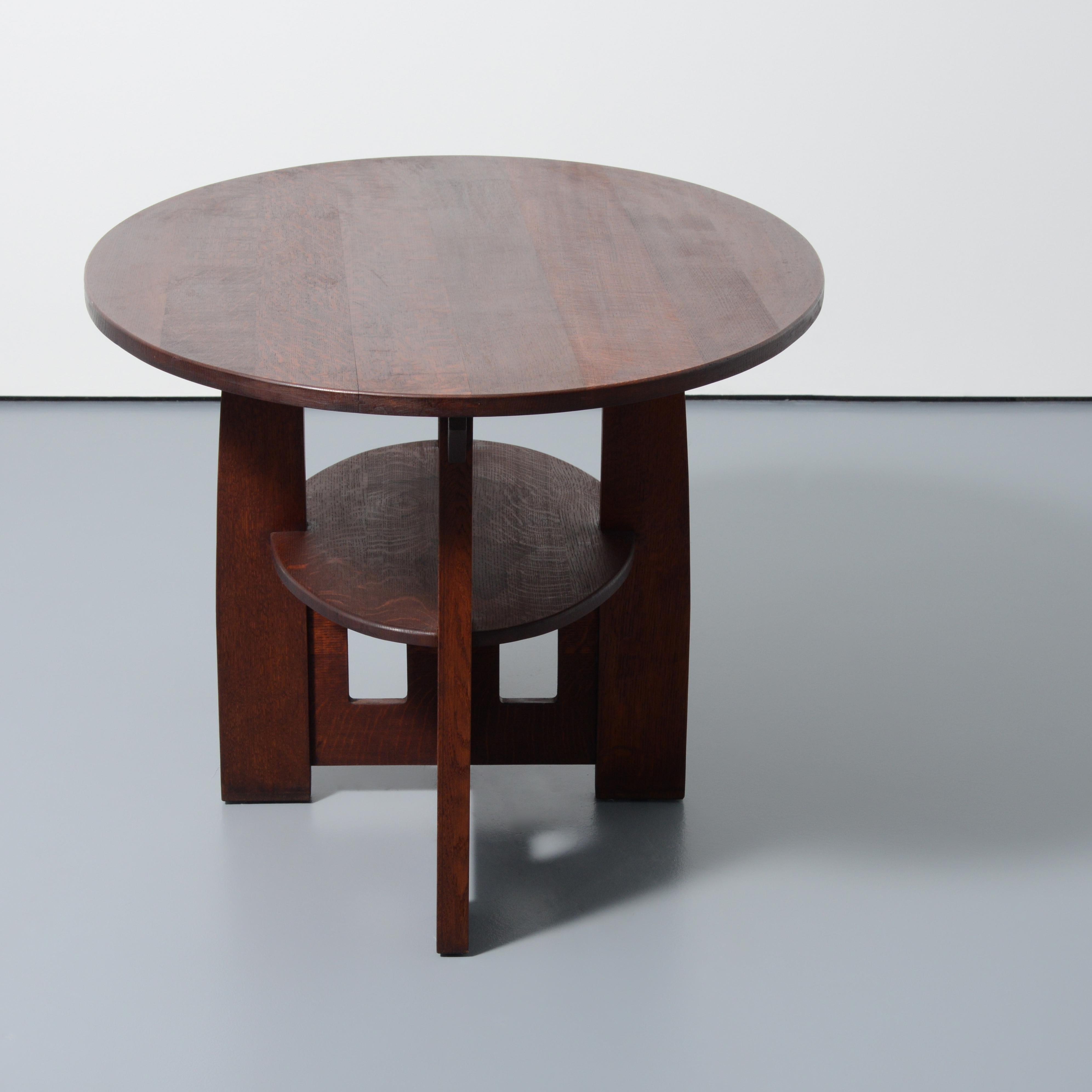 This is a rare gem in the manner of Stickley, and the arts and crafts, Mission Style. It is a vintage Arts & Crafts round oak occasional table. And although it is in the manner of St...