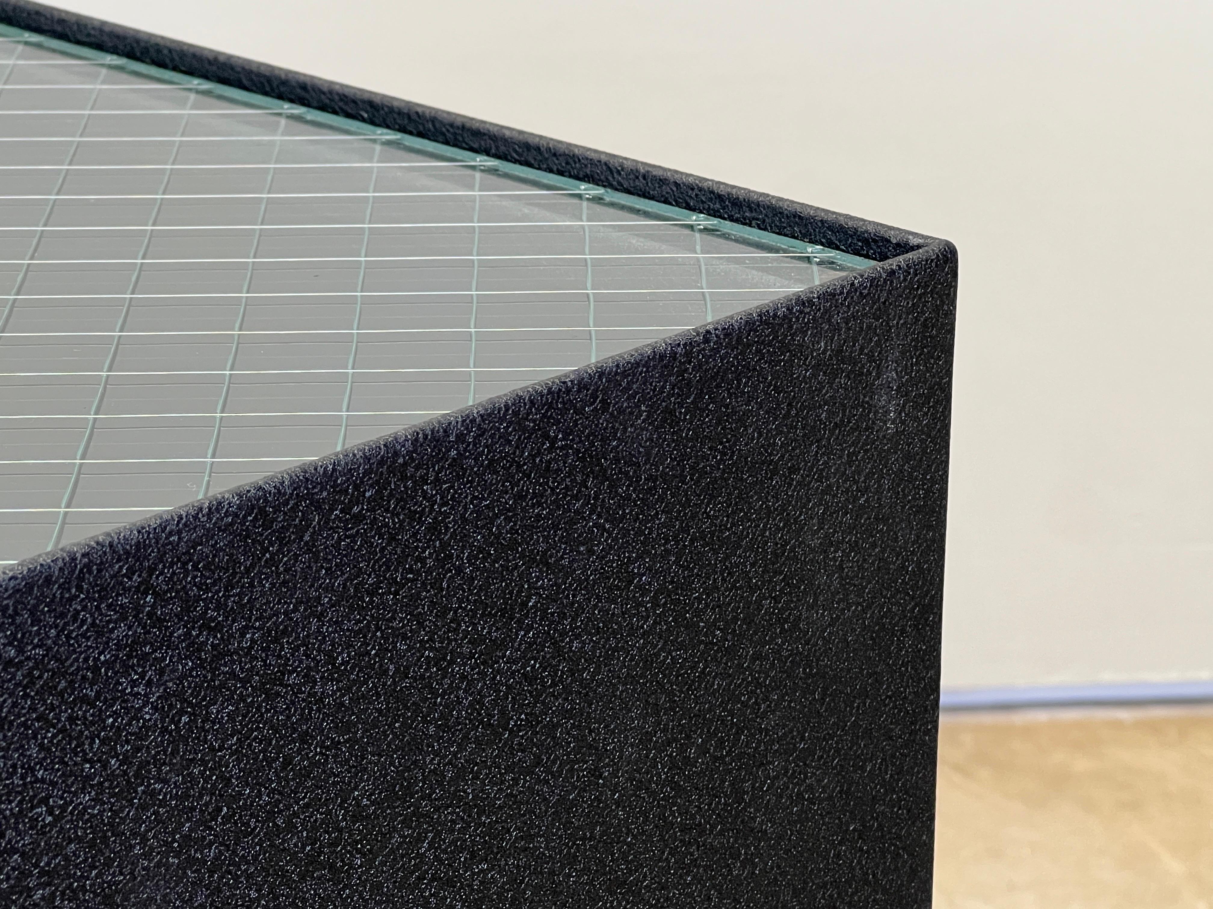 A pair of custom tables designed by Joe D'Urso for Knoll. This unusual pair were custom ordered with a textured black paint. These are all original with safety glass and casters.