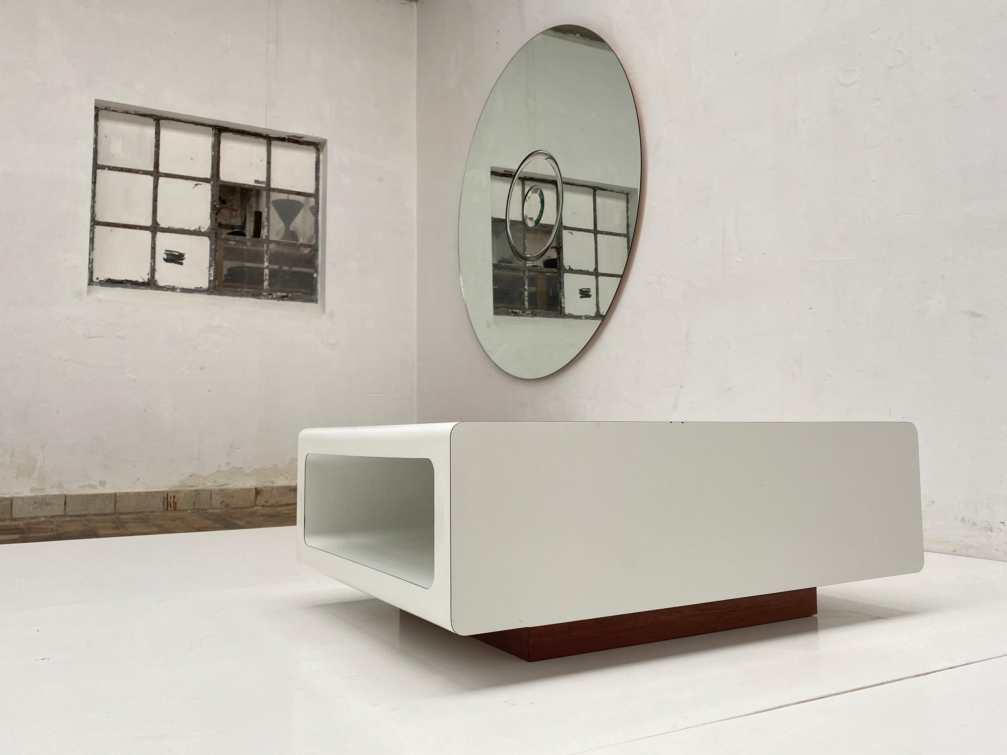 The table is high quality and extremely heavy for its dimensions, finished in elegant white laminate with elegant detailing such as the rounded corners and inset storage compartments, for bottles, plants, magazines etc which add greatly to the overall sculptural form. The white minimalist form is supported on a hardwood plinth and clearly shows influences from the 'Groupe de Recherche d'art Visuel' artists based in Paris who were creating experimental works in both kinetic and op art during the same period as well as the scene eminating out of the 'Galerie Rene Denise' who were exhibiting these key 1960s artworks