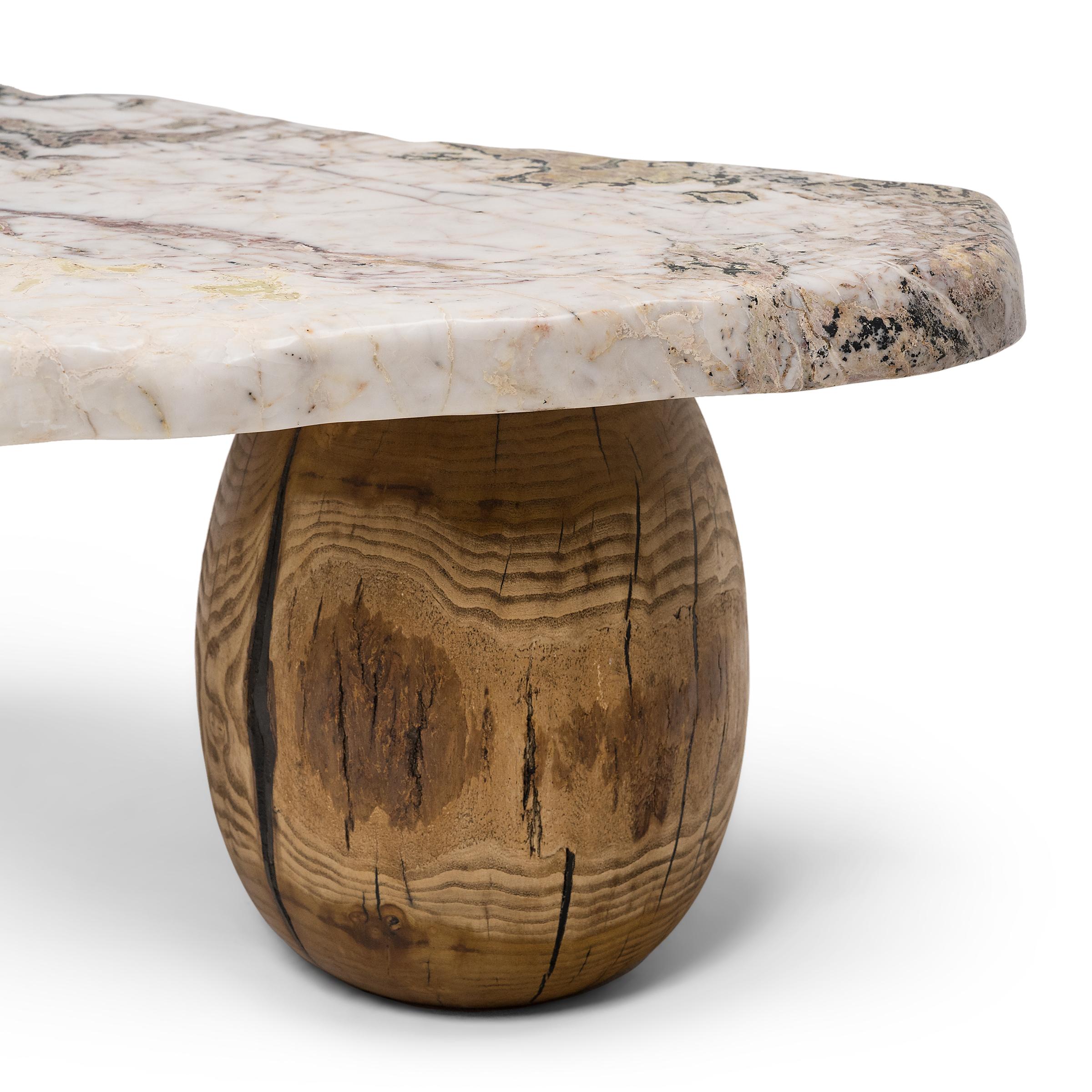 This meditation stone coffee table exemplifies organic modern style with an emphasis on natural materials. The tabletop is solid stone unearthed from Jiangsu province, comprised of white marble with mineral inclusions of pink, black and light green. With its sloping shape and "cracked ice" patterning, the marble slab resembles a snowy mountain peak, recalling the rocky horizons of shan shui (山水) landscape paintings.