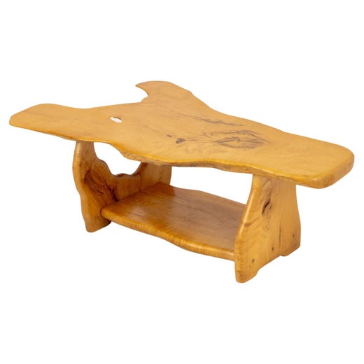 Steve Heller Live Edge Hand-Carved Maple Coffee Table, 1998, signed, marked "Fabulous Furniture", and dated to underside, with under tier shelf. 17" H 51" W x 32.25" D. Provenance: From a Brooklyn Collection.