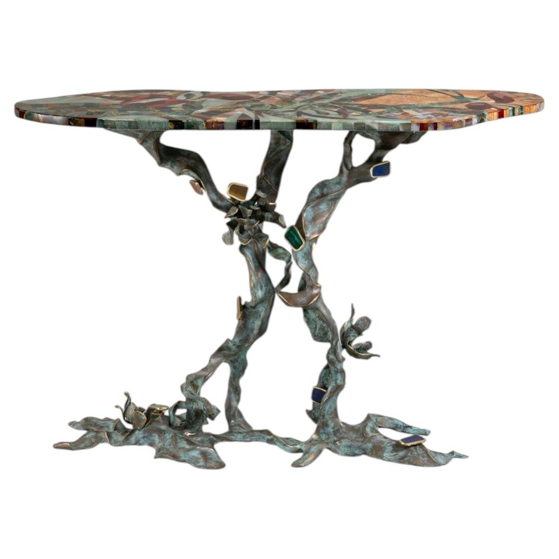 Rare "Surrealistic" console table in patinated bronze and pewter with hand painted polychrome enamels by Philip & Kelvin LaVerne, American 1960s (signed “Kelvin LaVerne” on bottom ri...