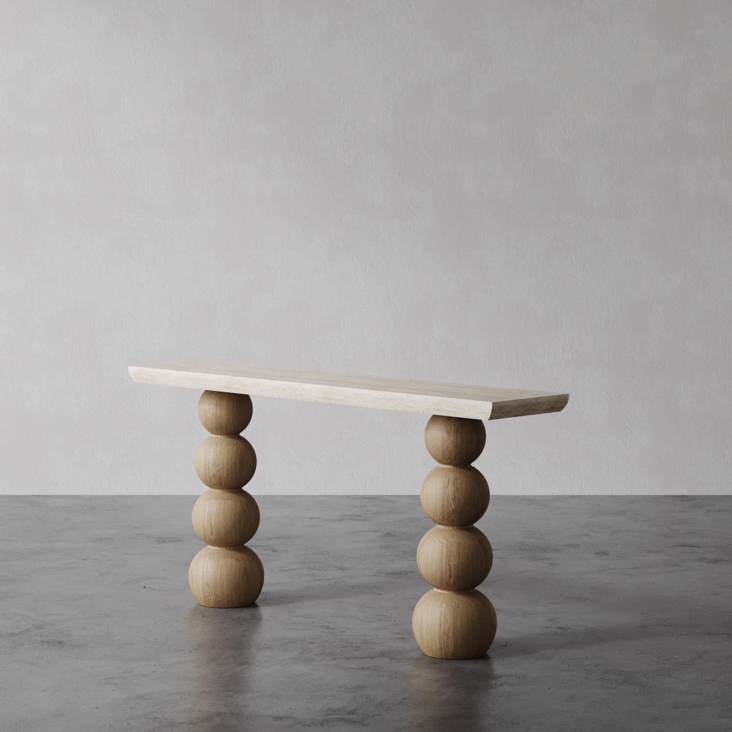 The Chloé Console Table nods to 1970s Italian stone ateliers, where craftsmanship and proportion defined design. A honed travertine slab rests on two hand-cast sculptural spheres in a cerused natural oak finish. The cast-composite provides long-term stability and visual balance, allowing the materials to take center stage. Each piece is handmade, with a unique veining that makes every console one of a kind. A statement console for entryways, hallways, or placed behind a sofa.