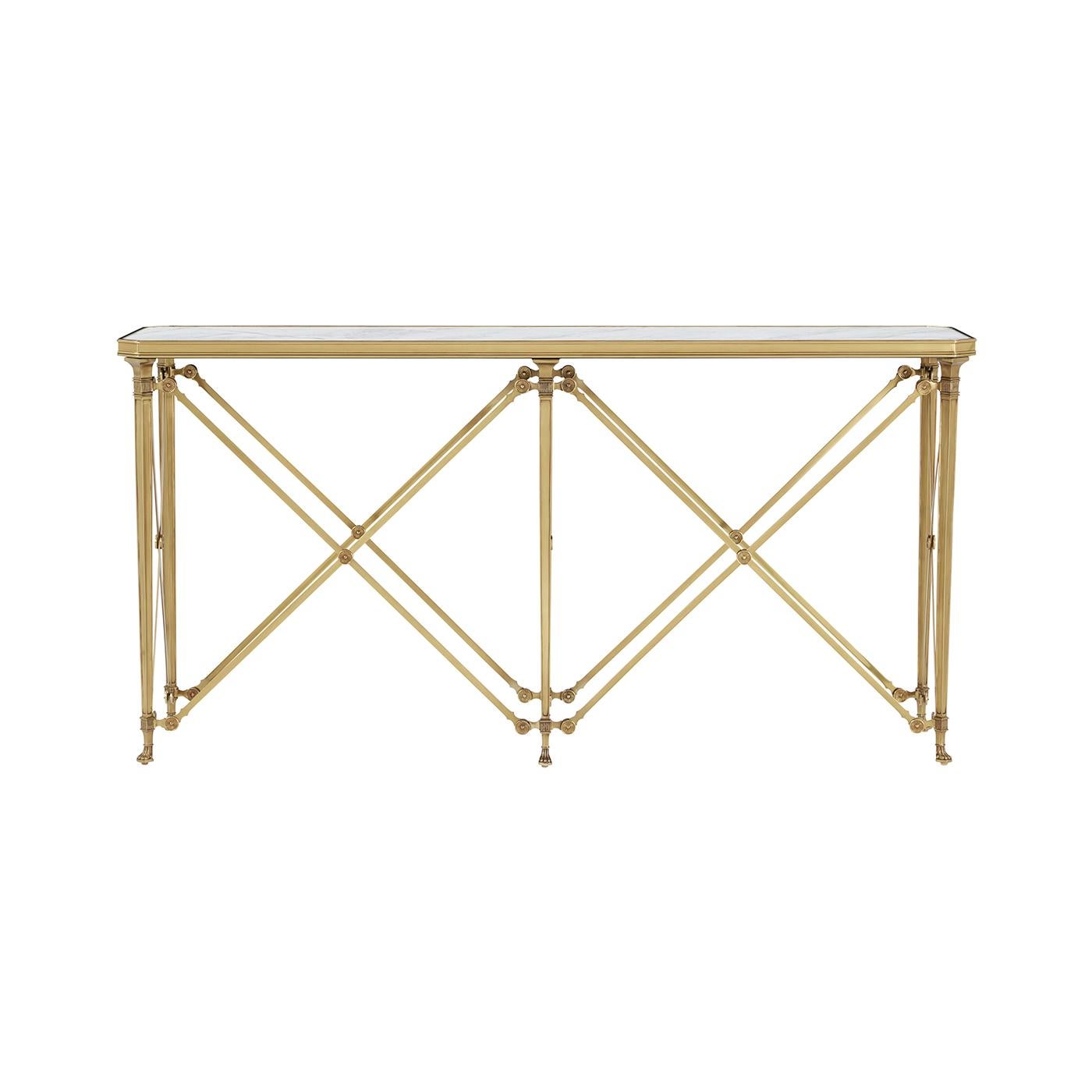 Early 19th-century French design anchored by a sleek quartz top with a refined moulded surround and elegant canted corners, this table blends architectural grace with timeless luxury. The cast brass frame features tapering legs ending in stylized paw feet—a definitive mark of Empire aesthetics—creating a commanding silhouette that elevates any hallway, entry way or living space.