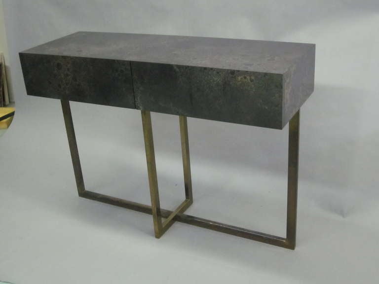 A Rare and Elegant French Mid-Century console /sofa table / credenza by Jacques Quinet in the Modern Neoclassical spirit with double drawers in patinated and laminated wood set on a delicate cross form patinated iron base. The console / chest is architecturally pleasing as it sits on its base and intriguing with its beautiful patinated laminate top. The piece is unique and a work of a sculpture as much as a functional piece of furniture.