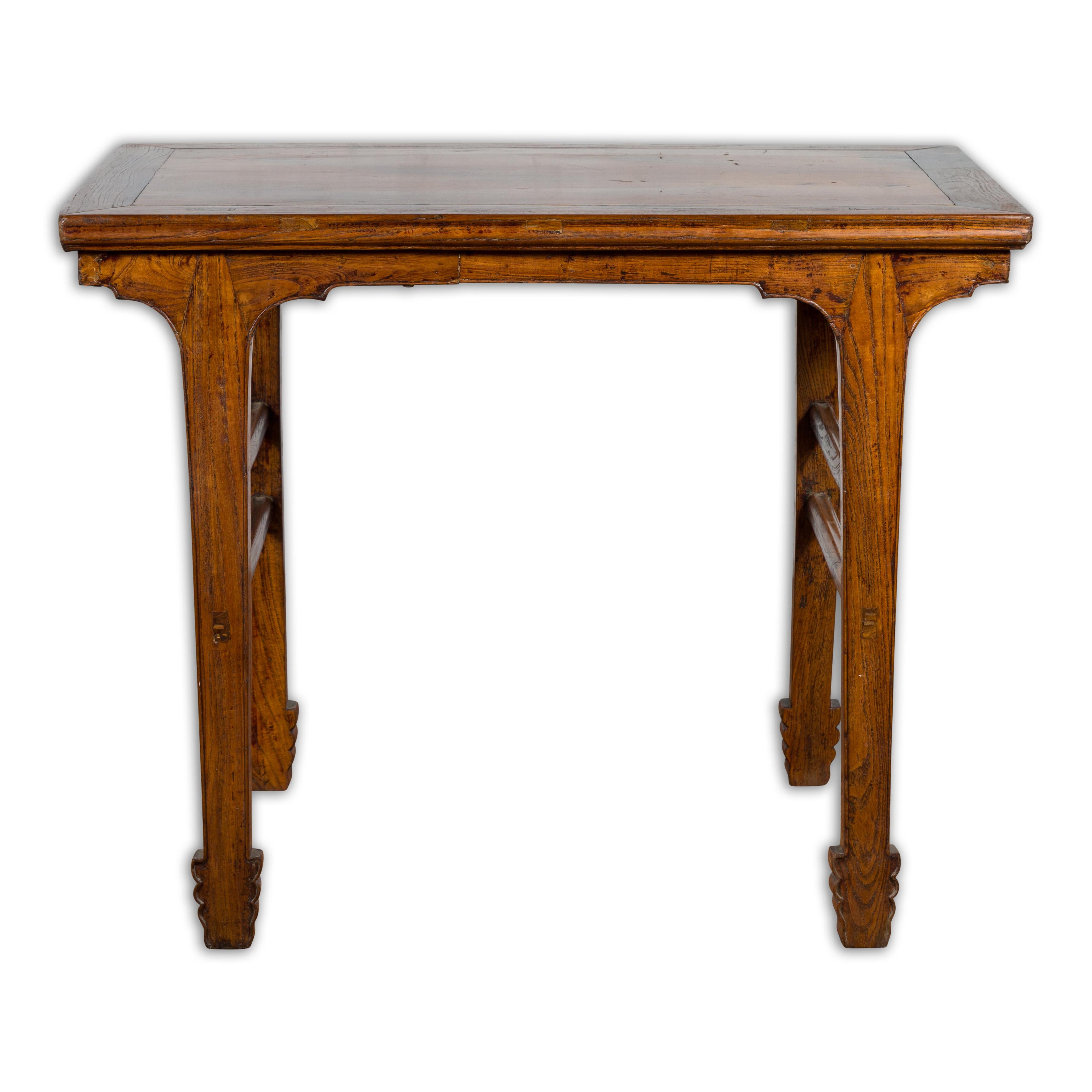 A Chinese Qing Dynasty period Elmwood wine tasting console table from the 19th century, with humpback stretcher and horse hoof feet. Created in China during the Qing Dynasty, this El...