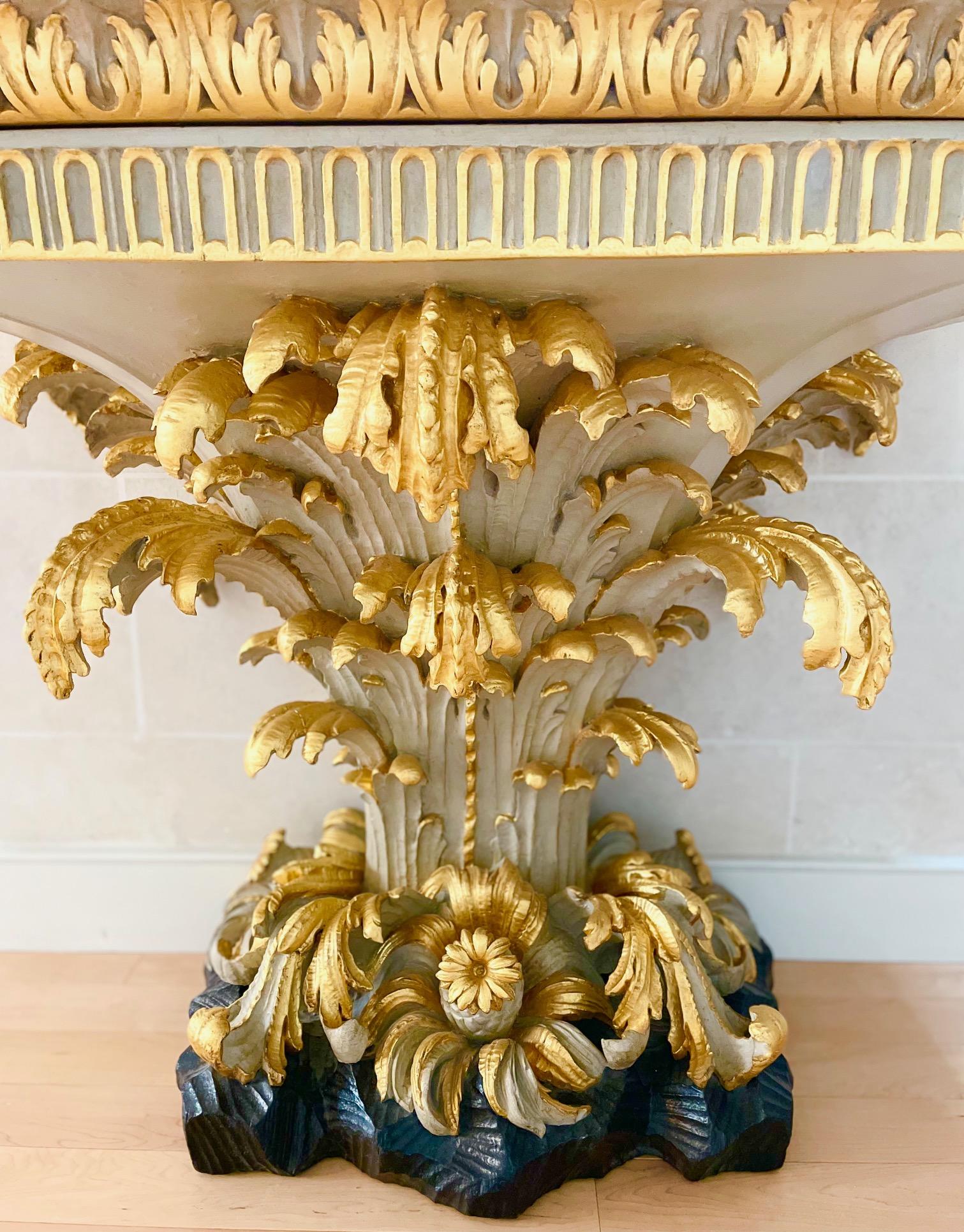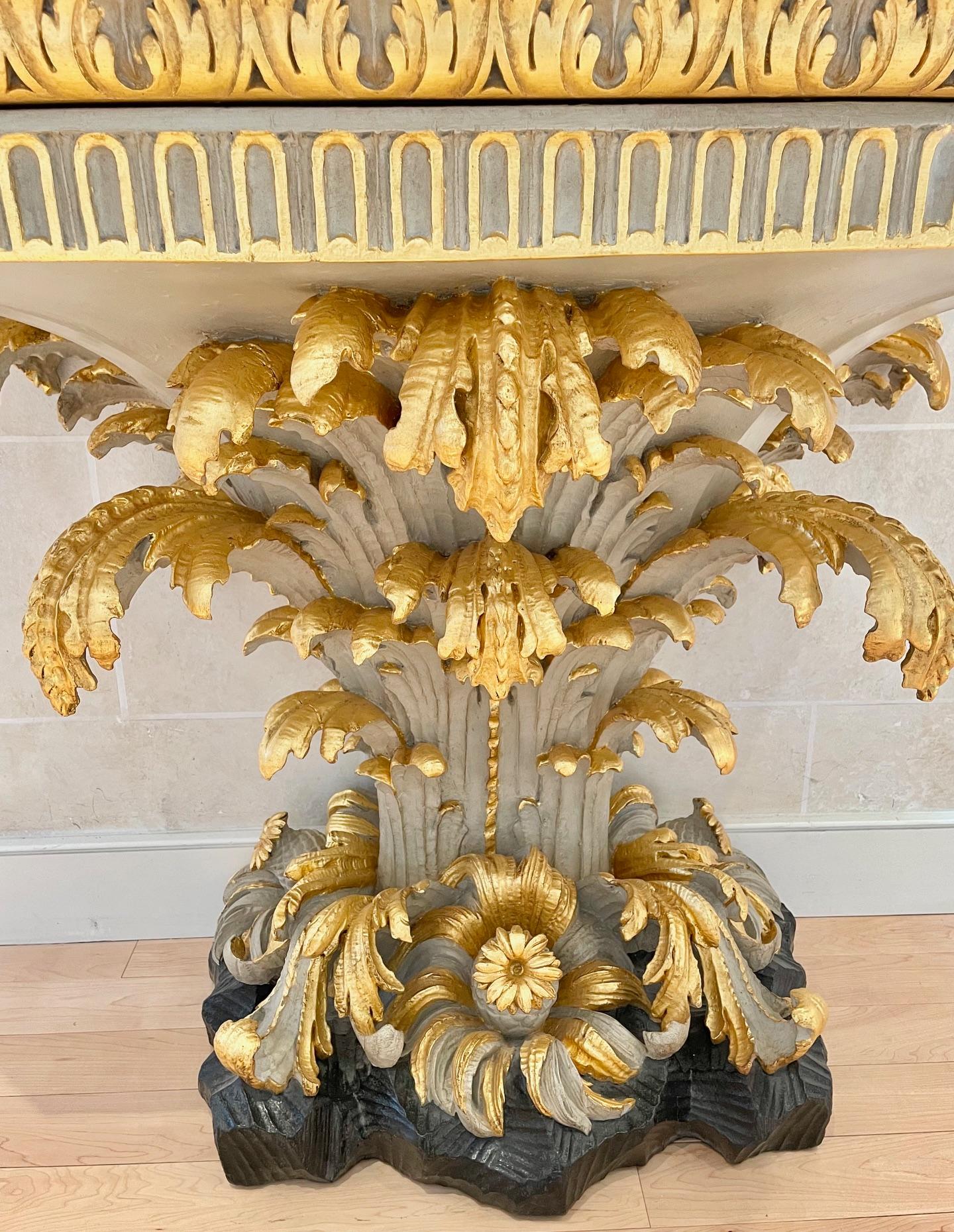 Elegant, slightly curved, half-moon console table, crafted from hand-carved wood, gilded with gold leaf, and painted. The console table features a geometric base and a columned shaft...