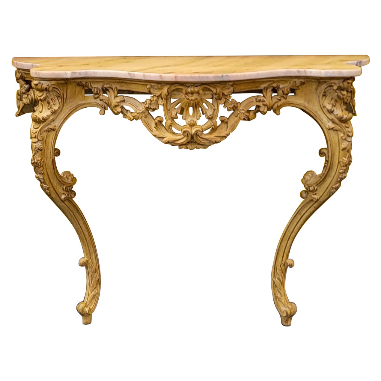 a beautiful Louis XV French giltwood console table with marble top. Heavily carved and pierced front apron. Two carved front legs curving into a carved shell motif. The top is the or...